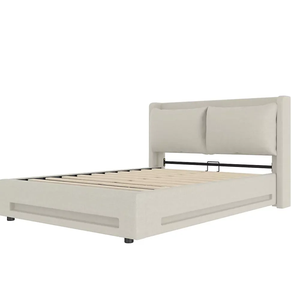 Design & styleCe lit 140×200 cm combine lignes contemporaines et matières naturelles. Le revêtement en lin beige apporte une sensation de confort et une esthétique chaleureuse, tandis que la tête de lit à étagère structure l’espace et garde l’essentiel à portée de main.Rangement hydraulique & éclairage Système hydraulique pour soulever facilement le sommier et accéder à un grand volume de rangement, idéal pour linge de lit et vêtements saisonniers. Bandes LED latérales intégrées créent une lumière d’ambiance pratique pour la lecture ou pour retrouver un éclairage doux le soir.Tête de lit multifonctionLa tête de lit intègre une niche de rangement, une petite veilleuse et une prise USB‑C pour recharger un téléphone sans sortir du lit. Le coussin amovible ajoute du confort lors de la lecture et se retire facilement pour le nettoyage.Matériaux & entretienStructure robuste, revêtement en lin respirant et douceur agréable au toucher. Le panneau inférieur est recouvert d’un tissu anti‑poussière pour protéger les objets stockés. Entretien simple : aspirateur doux ou chiffon légèrement humide selon les taches.Installation & livraisonMontage requis, deux personnes recommandées. Livré en 2 colis (dimensions totales produit 149x210x114 cm). Poids net 49,5 kg / brut 54,5 kg. Compatible avec matelas 20–25 cm. Sommier/boxspring requis selon configuration souhaitée.