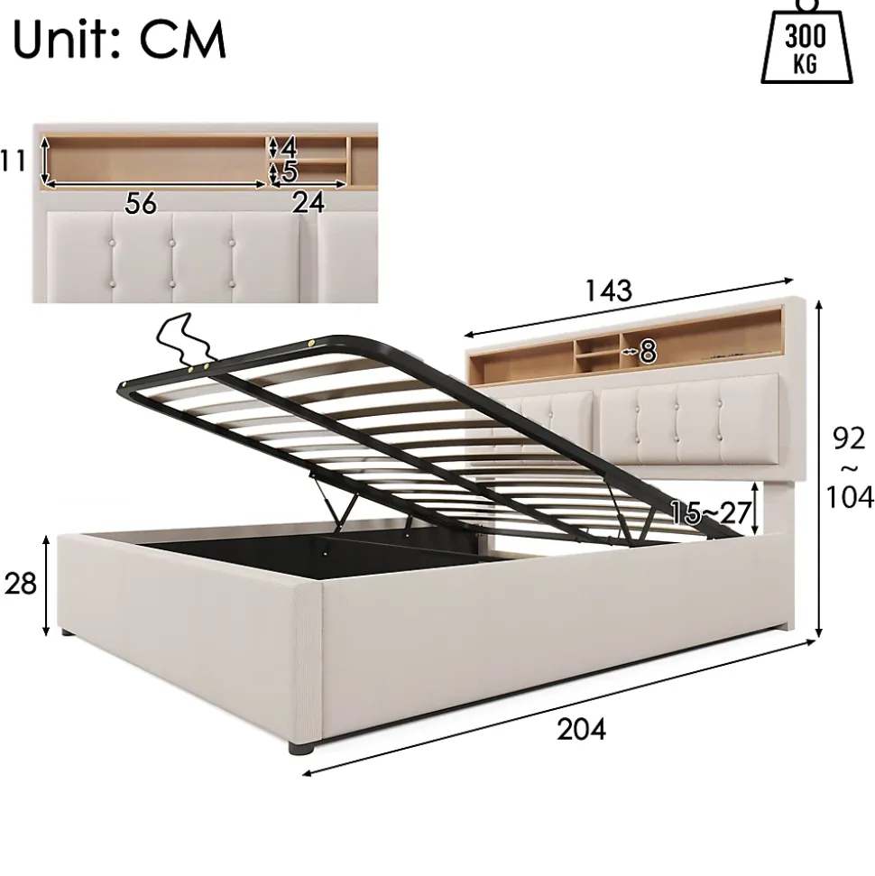 Design & style : Ce lit tapissé en lin beige (dimensions extérieures 143x204x92–104 cm) propose un esthétisme contemporain et discret adapté aux intérieurs modernes. La tête de lit rembourrée, garnie d’une mousse haute densité et réglable sur ±12 cm, offre un appui ergonomique pour la lecture ou la détente, et les bords adoucis réduisent le risque de chocs.Fonctionnalité & rangement : Pensé pour optimiser l’espace, le lit dispose d’une tête haute de 50 cm intégrant 4 casiers de rangement pour télécommandes, livres ou petits objets. Le sommier se relève aisément grâce à des vérins hydrauliques pour accéder à un vaste coffre de rangement sous le lit, pratique pour draps, oreillers et couvertures. Un fond en toile Oxford limite la poussière et maintient les affaires rangées propres.Matériaux & confort : Cadre rembourré en tissu lin, sommier composé de lattes 100 % bois massif associées à des éléments métalliques pour garantir solidité et soutien. Produit conçu pour un matelas 140×200 cm (matelas non fourni). Textiles testés selon le standard Öko‑Tex 100, non allergènes. Charge maximale recommandée pour l’ensemble : 300 kg.Station de charge intégrée : Pratique et discrète, la tête de lit intègre une boîte de charge avec 1 port USB, 1 port Type‑C et 2 prises européennes, permettant de recharger smartphone et tablette à portée de main. Les câbles peuvent être acheminés proprement pour limiter l’encombrement et préserver l’esthétique du lit.Installation & livraison : Montage requis, conseillé pour deux personnes ; visserie et notice fournies. Le lit est livré en 3 colis afin de réduire les risques de dommage pendant le transport ; ceux‑ci peuvent arriver séparément. En cas de pièces manquantes ou de problème à la réception, contacter le service client pour assistance.