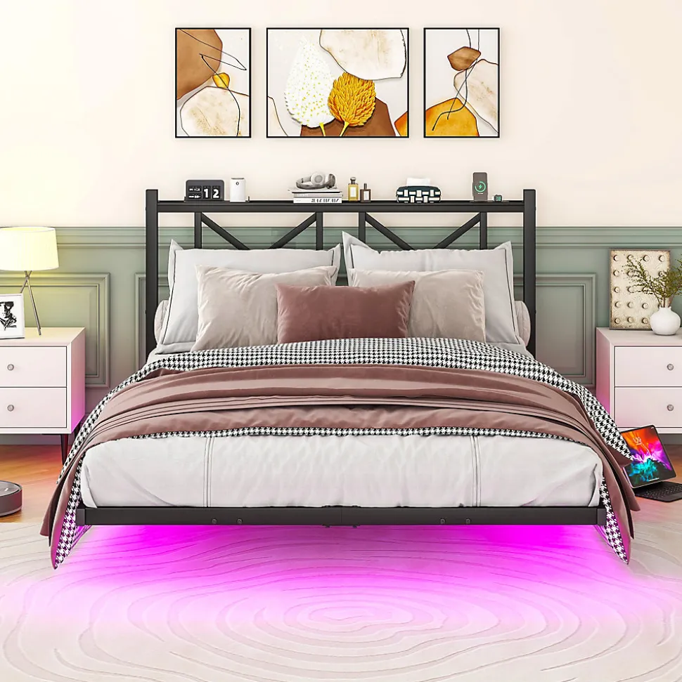 Design & styleCe lit 140×200 cm associe une silhouette contemporaine à une esthétique « flottante » obtenue par des pieds dissimulés, offrant une présence légère et soignée. Le cadre en métal noir et la bande lumineuse discrète sur trois côtés apportent une touche moderne sans détourner l’attention du reste de la chambre. La tête de lit intègre un espace de rangement peu profond, pensé pour poser téléphone, lunettes ou petits objets décoratifs.Fonctionnalité & rangement Rangement pratique dans la tête de lit pour garder l’essentiel à portée de main. Station de charge intégrée avec 1 prise et 2 ports USB, pour organiser et recharger appareils sans encombrer les tables de chevet. Bande LED sous le cadre réglable par commande tactile, choix de couleurs pour adapter l’éclairage aux moments (veilleuse, soirée film, ambiance douce). Structure porteuse optimisée : 22 lattes métalliques et 9 pieds d’appui pour une assise stable et une bonne répartition des charges.Matériaux & entretienCadre et lattes en métal traité, finition noire résistante aux usages quotidiens. Surfaces lisses faciles à entretenir : un chiffon doux légèrement humide suffit pour enlever la poussière. Conçu pour accueillir un matelas 140×200 cm (matelas non fourni).Installation & emballageMontage requis avec notice détaillée, deux personnes recommandées pour une installation aisée. Produit livré en un seul colis clairement identifié ; toutes les pièces sont étiquetées pour faciliter l’assemblage. Les connexions électriques et les fixations ont été contrôlées pour garantir une utilisation sûre et stable.