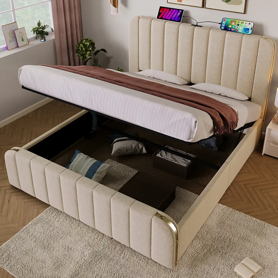 Design & styleCe lit 140×200 cm tapissé en tissu lin beige allie une esthétique contemporaine à des détails soignés : bandes métalliques dorées encastrées et rivets décoratifs sur la tête et les panneaux latéraux. Le contraste entre le métal et le textile crée une silhouette raffinée, tandis que la tête de lit au profil non rectangulaire limite les risques de chocs et offre un appui confortable pour la lecture ou la détente.Fonctionnalité & rangement Système de relevage hydraulique de qualité pour accéder facilement à un grand volume de rangement sous le sommier, idéal pour valises, linge de maison et articles hors saison. Deux butées au niveau de la tête empêchent le glissement du matelas et facilitent son emplacement. Port central USB et USB‑C intégré dans la tête de lit pour recharger vos appareils sans quitter le lit.Matériaux & confortStructure en métal laqué haute résistance associée à des lattes en bois massif pour un soutien homogène et une capacité d’utilisation jusqu’à 181 kg. Bandes EVA anti‑bruit intégrées pour réduire les frottements et favoriser un sommeil plus silencieux. Le tissu lin est testé selon le standard Oeko‑Tex, non allergène et agréable au toucher. Conçu pour accueillir un matelas 140×200 cm (matelas non inclus).Entretien & qualitéFinitions faciles à entretenir : dépoussiérage régulier ou nettoyage ponctuel avec un chiffon doux humide pour préserver l’aspect du lin ; parties métalliques à essuyer avec un chiffon sec. Conception robuste pensée pour un usage quotidien dans un cadre domestique.Installation & livraisonMontage requis, deux personnes recommandées. Le produit est expédié en 3 colis pouvant arriver séparément ; vérifiez la réception complète des éléments. Poids brut/net indicatif 49,7/43,6 kg. Dimensions totales approximatives après montage : 216x150x101 cm. Contenu : cadre de lit et sommier à lattes. En cas de pièces manquantes, merci de contacter le service client.