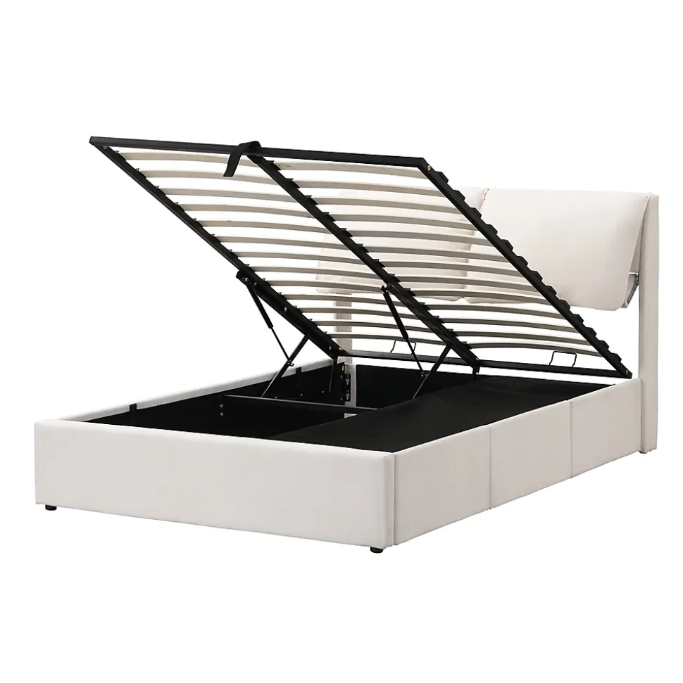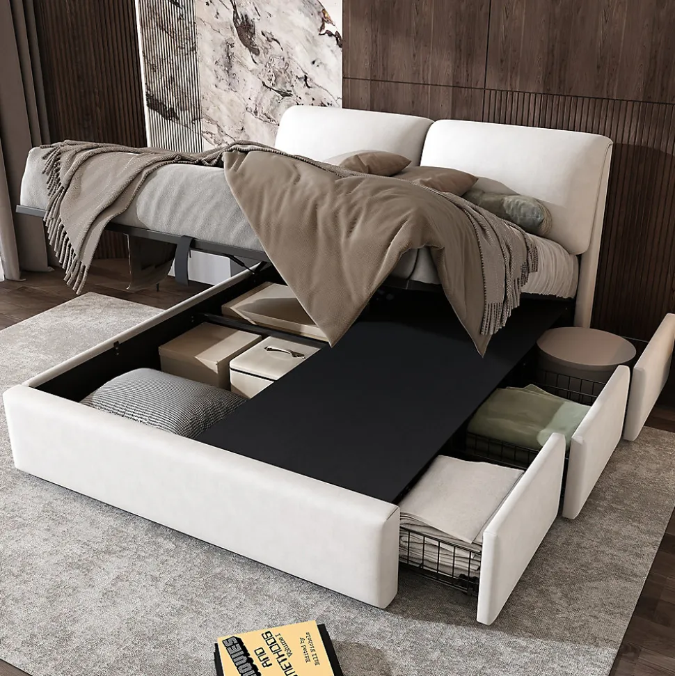 Design & styleCe lit 140×200 cm est tapissé en velours beige pour une finition chaleureuse et raffinée. La tête de lit aux formes ‘oreilles’ apporte une touche contemporaine et un soutien confortable, la hauteur réglable permettant d’adapter l’assise selon les usages (lecture, repos, télévision).Fonctionnalité & rangement Coffre de rangement avec mécanisme hydraulique facilitant l’accès aux espaces de stockage volumineux, idéal pour couettes, oreillers et textiles saisonniers. Trois tiroirs latéraux intégrés offrant un rangement supplémentaire pour draps, vêtements ou accessoires et optimisant l’utilisation de l’espace sous le lit. Configuration pensée pour garder la chambre ordonnée tout en conservant un accès pratique aux effets personnels.Matériaux & sommierStructure tapissée en velours résistant et agréable au toucher, associée à un sommier à lattes renforcées qui assure un bon maintien et protège la matelas. Le lit est conçu pour une charge maximale recommandée de 300 kg et convient aux matelas 140×200 cm (matelas non fourni).Entretien & confortLe velours se nettoie facilement avec un chiffon doux et une aspiration ponctuelle pour éviter l’accumulation de poussière. La tête de lit réglable améliore le confort d’assise et crée un support ergonomique pour lire ou se détendre. Les finitions sont pensées pour un usage quotidien et une présentation élégante.Installation & livraisonMontage requis, deux personnes recommandées pour un assemblage sûr et efficace. Produit livré en 2 colis pouvant arriver séparément; poids net total 55,1 kg. Notice et quincaillerie incluses pour faciliter l’installation et la mise en service.