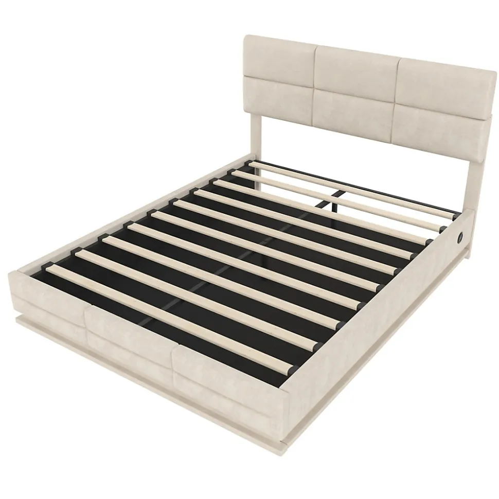 Design & styleCe lit 140×200 cm tapissé en velours beige apporte une allure contemporaine et chaleureuse à la chambre. La finition douce et texturée confère une sensation agréable au toucher et s’intègre naturellement aux décors minimalistes, scandinaves ou industriels sans alourdir l’espace.Fonctionnalité & rangement Coffre de rangement XXL sous le sommier, optimisant l’espace de la pièce et permettant de stocker linge de lit, oreillers et vêtements saisonniers. Système hydraulique silencieux pour une ouverture et une fermeture aisées et sécurisées, sans effort ni bruit excessif. Ports de charge intégrés (USB) sur les côtés du cadre pour garder vos appareils accessibles et organisés pendant la nuit.Tête de lit & éclairageTête de lit réglable en trois positions pour adapter l’inclinaison à la lecture, au confort devant la télévision ou au repos. Éclairage LED d’ambiance dimmable avec réglage de la température de couleur pour créer une atmosphère plus chaude ou plus neutre selon le moment de la journée.Matériaux & entretienStructure tapissée en velours beige, résistante et facile à entretenir : dépoussiérage régulier et nettoyage ponctuel à l’aide d’un chiffon doux. Conçu pour accueillir une épaisseur de matelas de 25–30 cm (matelas non fourni). Charge maximale recommandée : 250 kg.Spécifications techniquesDimensions extérieures approximatives : 142 x 206 cm. Hauteur de la tête de lit réglable entre environ 105 et 115 cm selon la position choisie. Poids net/brut approximatif : 47 / 52,1 kg. Quantité de colis : 2.Installation & livraisonMontage requis, deux personnes recommandées pour un assemblage sûr et efficace. Produit livré en deux colis pouvant arriver séparément ; notice incluse pour guider les étapes de montage et l’utilisation du système hydraulique et des réglages LED.