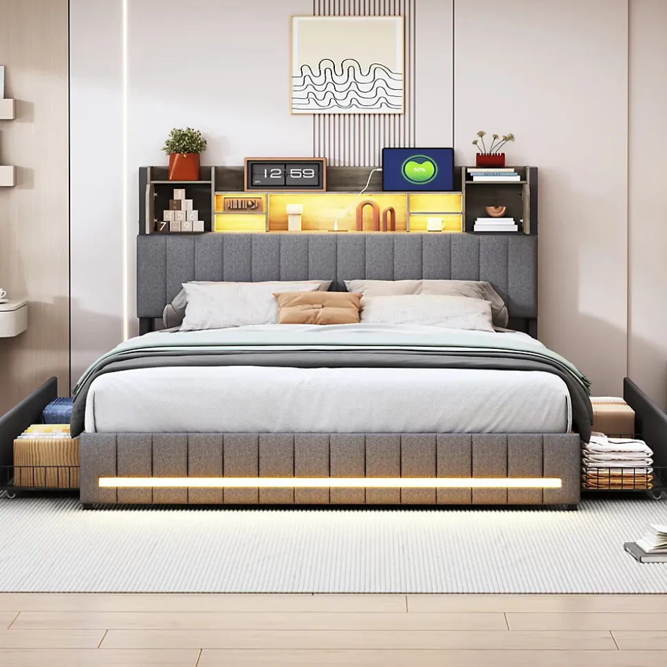 Tête de lit avec ports USB : l’une des caractéristiques les plus pratiques est la prise intégrée à la tête du lit, avec laquelle vous pouvez charger votre téléphone portable et votre tablette avant d’aller vous coucher. Éclairage LED : l’éclairage LED ajoute un style moderne à votre chambre à coucher, avec la télécommande, vous pouvez changer les différentes couleurs et luminosités pour vous allonger confortablement.Design de rangement : le lit est équipé de 4 tiroirs de grande capacité. Les deux côtés du lit sont équipés de boucles de tiroir qui permettent de fixer fermement le tiroir au lit lorsque le tiroir n’est pas utilisé pour que votre chambre soit bien rangée. Les boîtes de rangement se déroulent et se déroulent facilement grâce aux roulettes au sol.Pratique et design : le lit allie habilement design élégant et confort optimal. La structure du lit est principalement en fer, durable et a une capacité de charge allant jusqu’à 600 lbs. Les pieds de support supplémentaires de la barre centrale peuvent assurer la stabilité fiable du lit.Rangement sur la tête de lit : il s’agit d’un nouveau lit rembourré qui combine deux fonctions : décoration et rangement LED. L’espace de rangement sur le lit est divisé en une zone interne et une zone externe, avec 10 compartiments externes de différentes capacités pour les besoins quotidiens. La partie rembourrée au milieu du lit peut être ouverte pour ranger des objets plus grands.Détails du produit :Dimensions totales : 165 x 217.5 x 126 cm (l x l x H).Matériau du panneau : matériau de linCouleur : grisMax. Poids de l’utilisateur: 300kgType de charge : 2 USBBoxspring requis : aucun.Montage requis: OuiContenu de la livraison : structure de lit + USB + tiroirs.Design unique : USB + tiroirsMatelas applicable (matelas non inclus) : 160 x 200 cmQuantité du colis : 2.