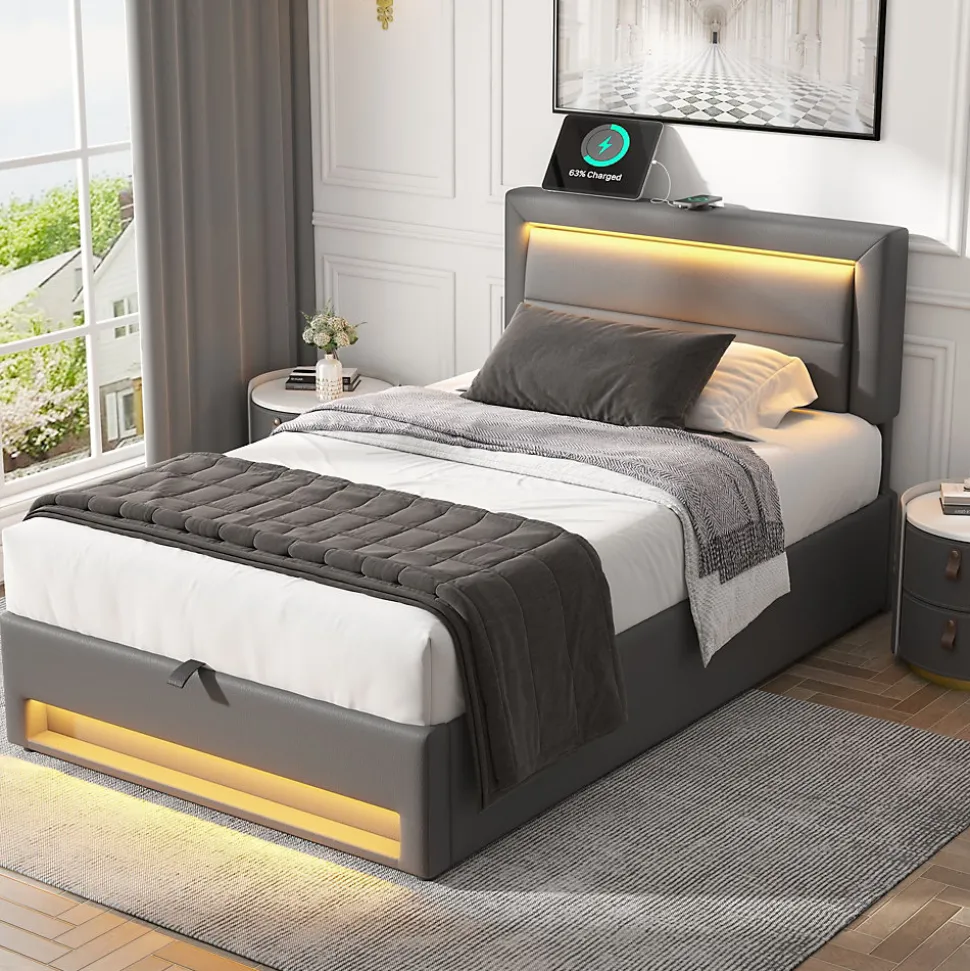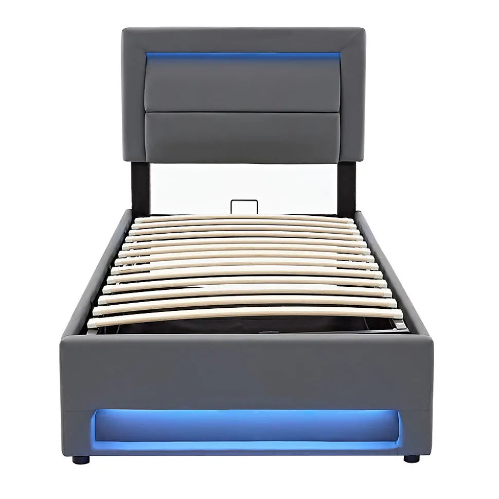 Design & style Ce lit tapissé en PU gris présente un motif litchi discret et des lignes contemporaines pour s’intégrer dans une chambre moderne. Dimensions compactes 160×190 cm, vendu sans matelas afin de laisser le choix du confort selon vos besoins.Éclairage & connectique Équipé d’un éclairage LED multicolore commandé par télécommande offrant plusieurs ambiances de lumière. Ports USB escamotables dotés d’un mécanisme à pression : en position relevée ils permettent la charge filaire, en position rentrée la surface accepte la charge sans fil pour les appareils compatibles.Fonctionnalité & rangement Le lit dispose d’un espace de rangement sous la structure pour linge de lit et accessoires, facilitant l’organisation de la chambre. Conception pratique pensée pour optimiser l’espace tout en conservant un accès simple aux solutions de charge et à l’éclairage.Structure & matériaux Cadre tapissé en PU avec sommier à lattes larges de 5 cm offrant un soutien homogène et une répartition régulière du poids. Charge maximale recommandée 150 kg. Poids net du produit 36 kg. Matériaux sélectionnés pour un aspect soigné et un entretien facile.Installation & livraison Montage requis, deux personnes recommandées ; outillage minimal nécessaire. Produit livré en 2 colis, instructions incluses. Entretien simple : surfaces PU nettoyables avec un chiffon doux et un détergent doux si besoin. Épaisseur de matelas recommandée 20–30 cm pour un confort optimal.