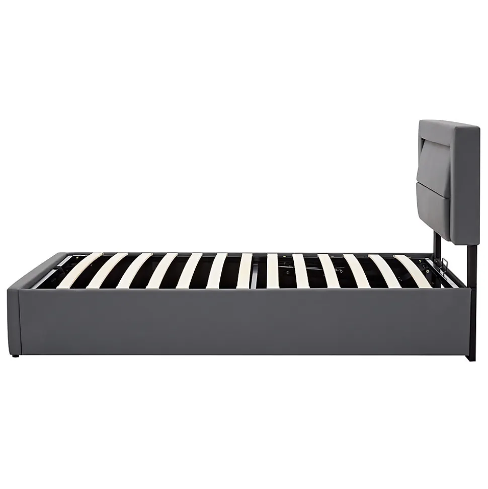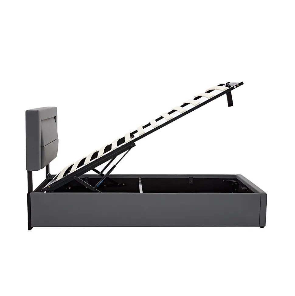 - Ports USB escamotables à pression pour charge filaire ou sans fil. Sommier à lattes larges de 5 cm assurant soutien uniforme, structure stable et rangement pratique sous le lit.