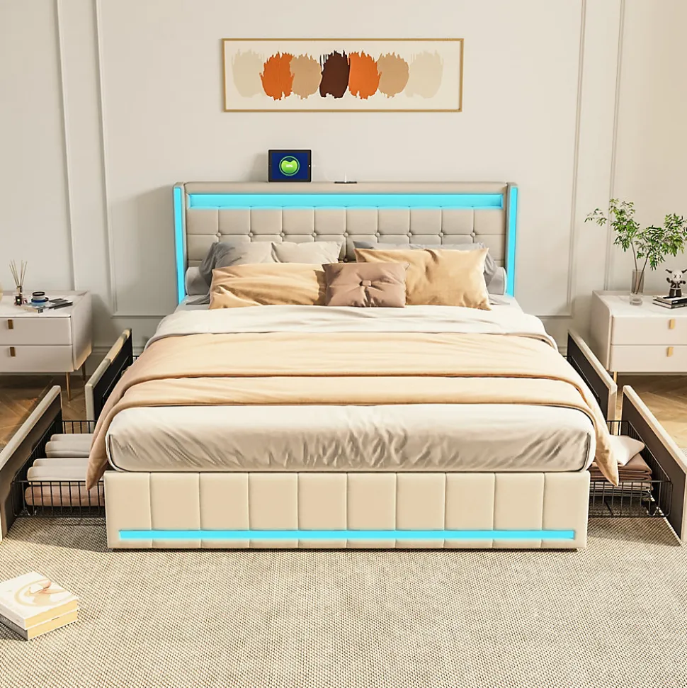 Lit 160x200 avec Sommier LED et USB, Lit Coffre 140x200 avec Lattes et 4 Tiroirs , Beige
