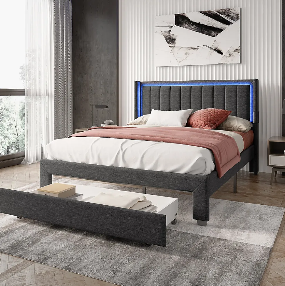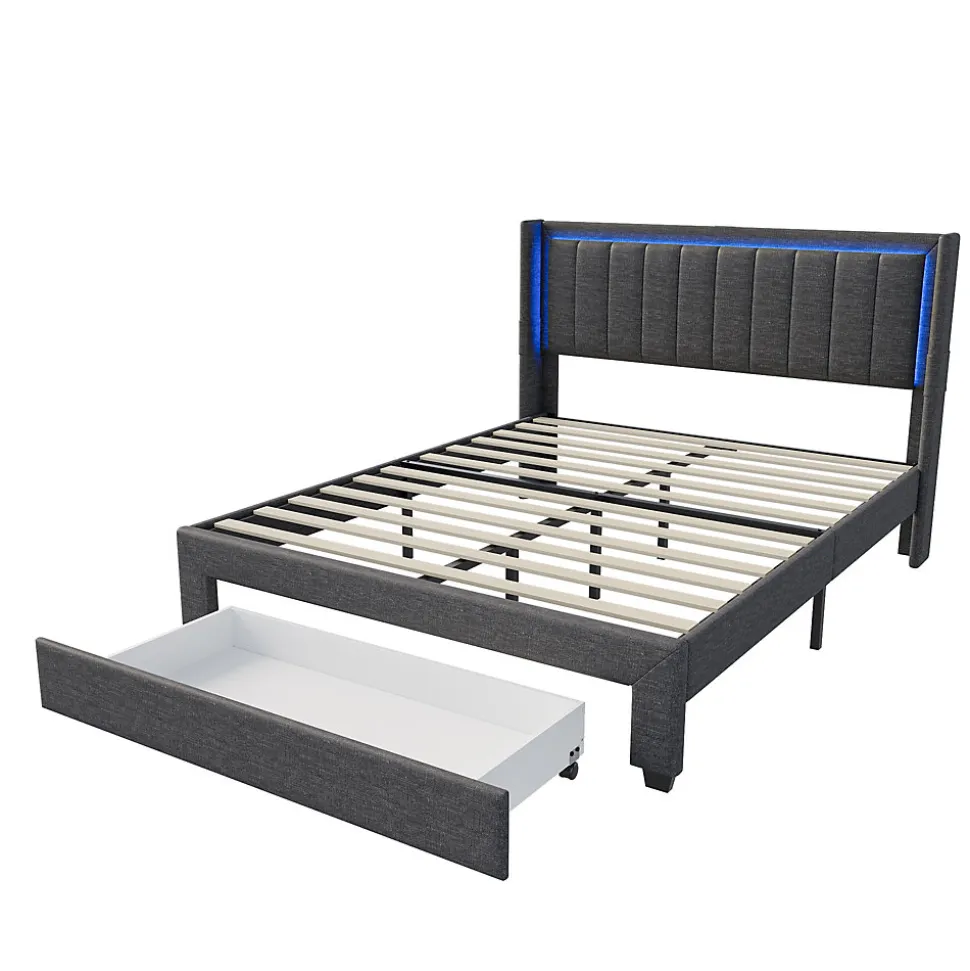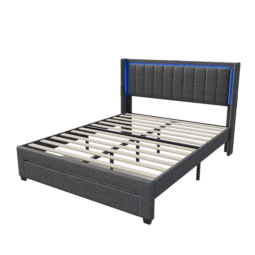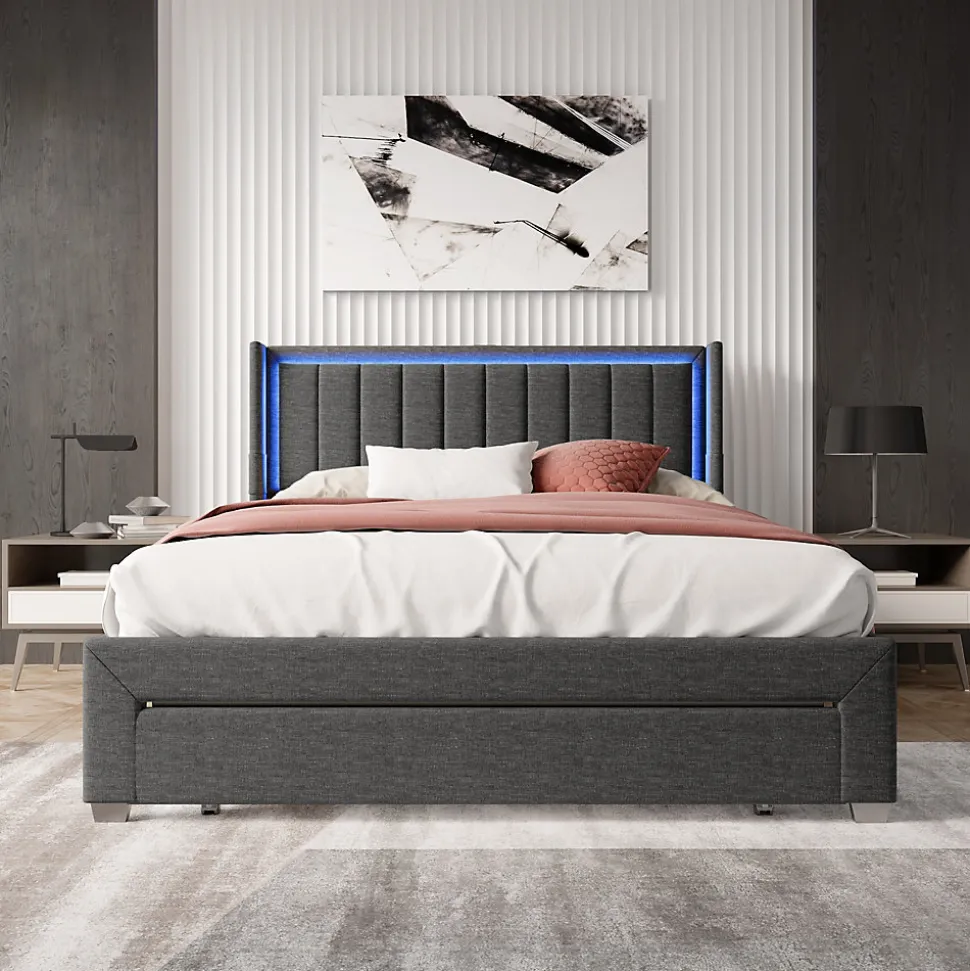 【Station de charge USB】Ce lit combine astucieusement un design élégant et un confort maximal. Les ports de charge sur la tête de lit comprennent des ports USB et Type-C, ce qui permet de charger vos appareils électroniques facilement. Vous pouvez charger votre téléphone et votre tablette avant de vous coucher pour les utiliser confortablement au lit.【Éclairage LED】La tête de lit est équipée de lumières LED, ajoutant une touche moderne à votre chambre. La tête de lit LED peut servir de dossier confortable lors de la lecture ou du visionnage de la télévision. Avec la télécommande, vous pouvez changer la couleur et la luminosité pour vous allonger confortablement.【Matériau doux pour la peau】Le tissu en lin doux réduit efficacement le risque de blessures causées par des coins et des bords pointus pendant l’utilisation, s’intégrant parfaitement dans votre chambre pour offrir un style chic et minimaliste qui reflète votre quête de qualité de vie.Description:Matériau : Lin + MDFCouleur : GrisNombre de colis : 2Assemblage requis : oui.Temps de montage estimé : 1 heureNombre de personnes recommandées : 2Dimensions du lit : 160 x 200 cm (sans matelas)Poids du produit : 53 kgCapacité de charge maximale : 250 kgDimensions du produit : 204 x 164 x 114 cmRemarque sur les dimensions : Toutes les dimensions sont approximatives