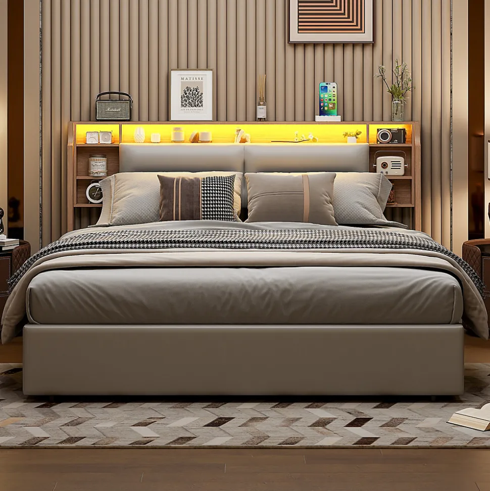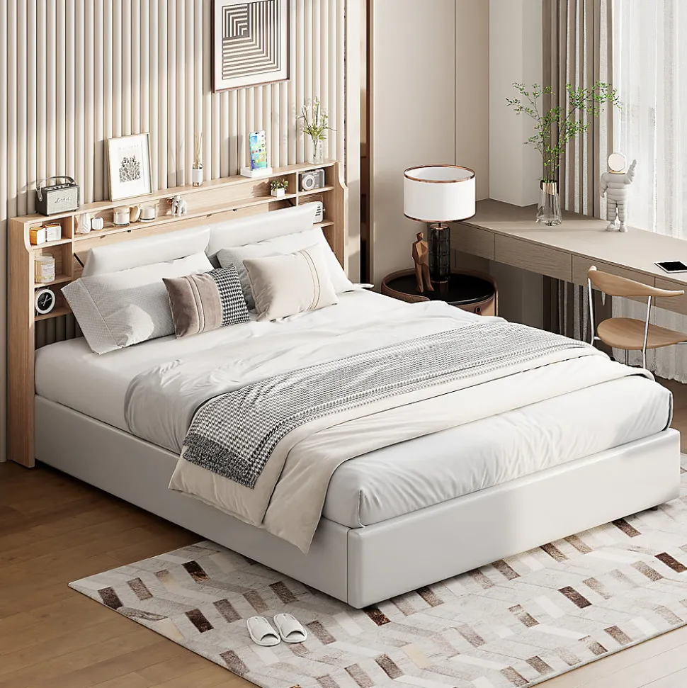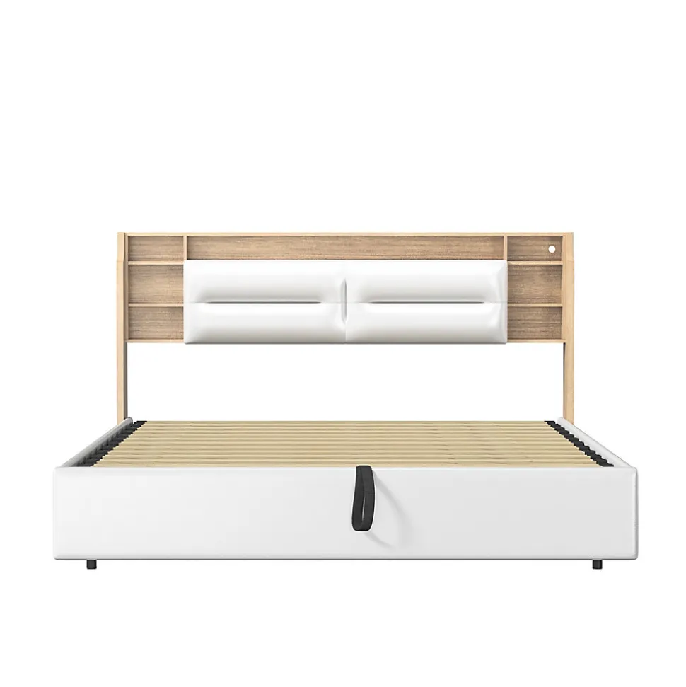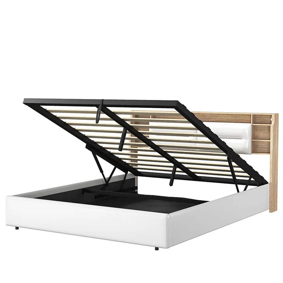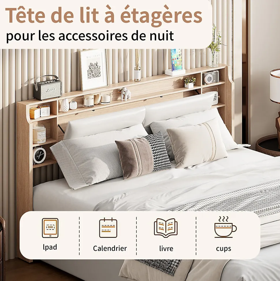 Design Multifonctionnel : Profitez dun cadre de lit moderne 160×200 cm avec sommier à lattes intégré. La tête de lit est équipée de 3 compartiments spacieux pour ranger vos livres, réveils ou autres accessoires.Rangement Pratique : Le lit dispose dun coffre de rangement avec mécanisme hydraulique, idéal pour stocker vos draps, oreillers et couvertures, tout en optimisant lespace de votre chambre.Éclairage LED et Port USB : Tête de lit avec LED intégrée réglable via télécommande ou smartphone. Deux ports USB permettent de recharger vos appareils électroniques facilement.Matériaux Haut de Gamme : Cadre en PU blanc imperméable et facile à nettoyer, offrant une finition élégante et durable pour un style contemporain.Livraison en Plusieurs Colis : En raison des grandes dimensions du lit, celui-ci sera livré en 2 colis séparés. Ne vous inquiétez pas si tous les colis narrivent pas en même temps.Lit double rembourré, espace de rangement hydraulique, tête de lit avec éclairage LED.Remarques : En raison de mesures manuelles, une erreur de 2 à 3 cm peut se produire. Ce produit sera livré en 2 colis. Ils peuvent ne pas arriver en même temps. Veuillez patienter. Si le client a des questions pendant l’installation, veuillez nous contacter dès que possible.Description Matériau : Bois massif + PU + Métal Couleur : Blanc Nombre de colis : 2 Assemblage requis : oui Dimensions du produit : 208 x 160.5 x 95 cm Dimensions du lit : 160 x 200 cm (sans matelas) Poids du produit : 47 kg Charge maximale du lit : 300kg