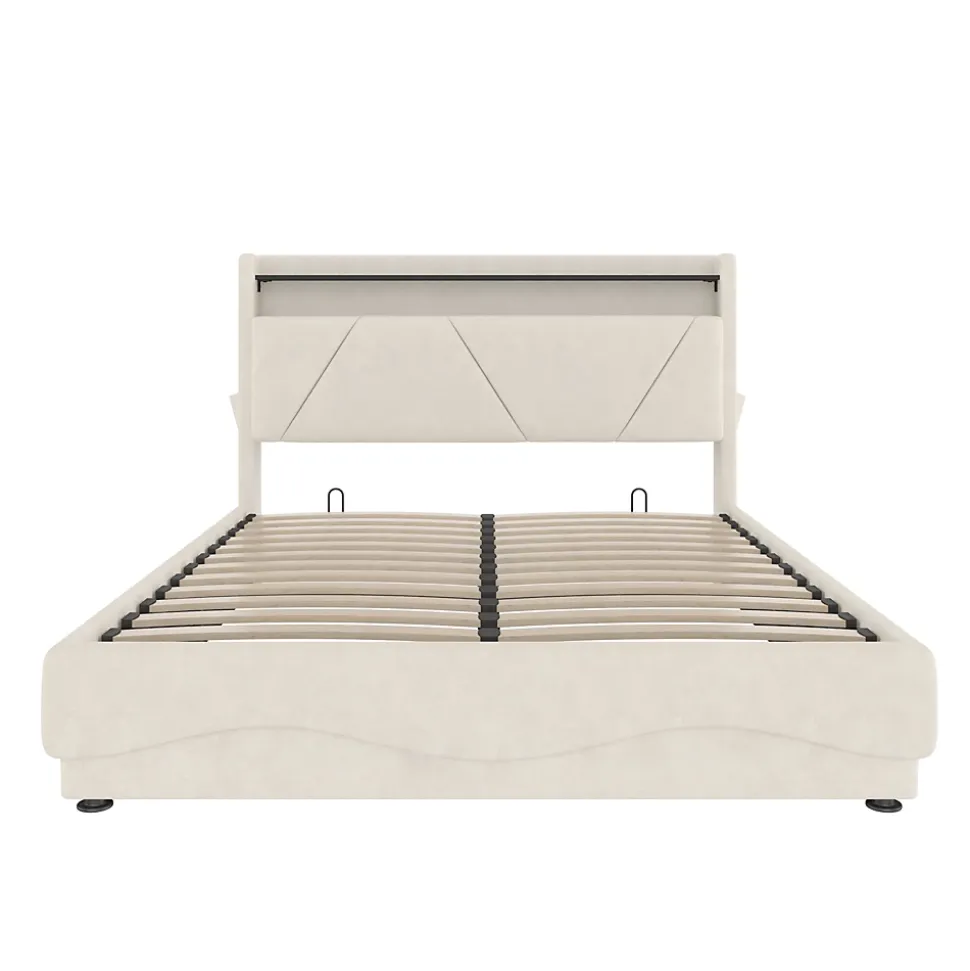 - Design contemporain en velours beige aux lignes épurées, tête de lit munie d’une étagère ouverte et d’un bandeau LED pour une ambiance douce tout en offrant un rangement pratique pour les objets de chevet.