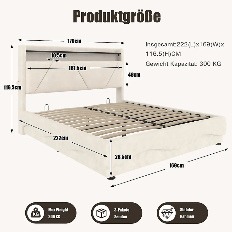 Design & styleCe lit 160×200 cm habillé de velours beige combine lignes contemporaines et détails pratiques. La tête de lit intègre une étagère ouverte et un bandeau LED pour une lumière douce et un rendu esthétique raffiné, complété par une bande LED en vague sur les côtés qui crée un point lumineux décoratif.Fonctionnalité & rangement Étagère ouverte au niveau de la tête de lit pour garder livres, lunettes ou réveil à portée de main. Tête de lit multifonction avec espace de rangement dissimulé et pochettes latérales pratiques pour télécommande et téléphone. Sommier à lattes assisté par vérin gaz pour un accès aisé au coffre inférieur et une capacité d’utilisation jusqu’à 300 kg.Matériaux & entretienRevêtement en velours beige confortable et facile à harmoniser. Structure robuste conçue pour un usage quotidien. Pour l’entretien, dépoussiérer régulièrement et nettoyer avec un chiffon doux; éviter les produits agressifs afin de préserver l’aspect du velours et des finitions.Caractéristiques & emballageDimensions totales : 222x169x116,5 cm (lit adapté pour matelas 160×200 cm, matelas non fourni, épaisseur recommandée 25–30 cm). Équipements : éclairage LED, prises USB et Type‑C certifiées CE intégrées. Nécessite boxspring. Produit livré en 3 colis (poids net/environ 61 kg, brut/environ 68,5 kg).Installation & livraisonMontage requis, deux personnes recommandées pour manipuler le sommier à vérin et assembler la structure. Produit livré en plusieurs colis pouvant arriver séparément; suivre la notice fournie pour un assemblage sécurisé.