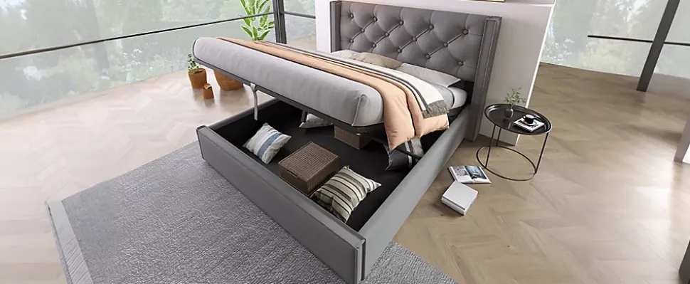 - Coffre spacieux sous sommier relevable par vérins hydrauliques, fond en tissu Oxford anti‑poussière ; bandes antidérapantes au niveau des lattes limitant le glissement de la matelas.