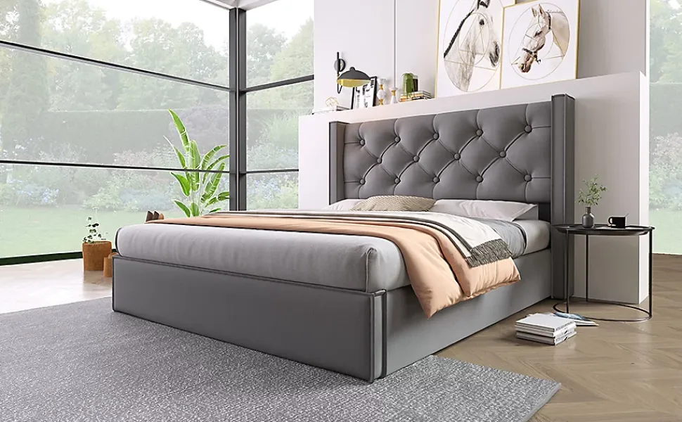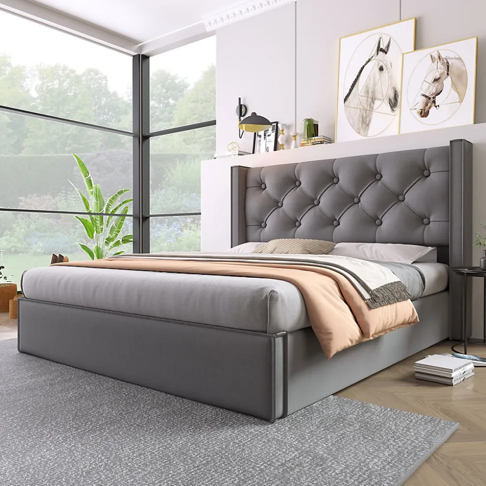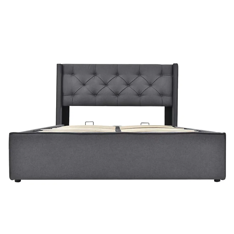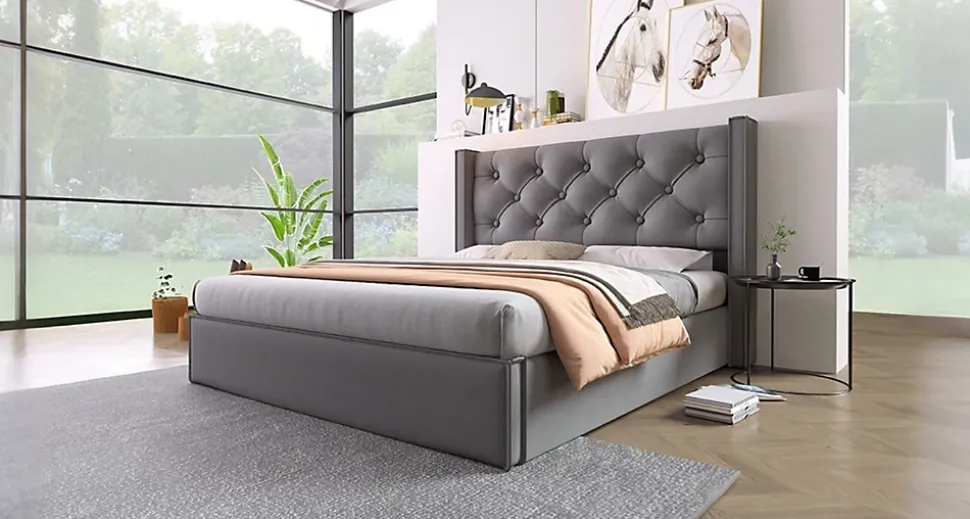 Design & styleCe lit 160×200 cm se distingue par une tête de lit capitonnée en tissu coton gris, avec surpiqûres régulières et capitonnage profond qui lui confèrent une esthétique rétro maîtrisée et une identité chaleureuse. Les matériaux souples réduisent l’exposition aux arêtes vives, contribuant à un usage plus sûr au quotidien pour toute la famille.Fonctionnalité & rangement Grand coffre sous sommier relevable actionné par vérins hydrauliques, permettant un accès complet à l’espace de rangement pour couettes, oreillers et linge de saison. Fond en tissu Oxford conçu pour limiter la pénétration de la poussière et protéger le contenu du coffre. Bandes antidérapantes positionnées au niveau des lattes pour réduire les déplacements de la matelas et stabiliser la zone de couchage.Matériaux & entretienStructure combinant éléments métalliques et pièces en bois massif selon la version, lattes en pin élastiques pour un soutien réparti. Revêtement en coton gris au toucher doux ; les surfaces se nettoient facilement à l’aide d’un chiffon doux légèrement humide. Éviter les produits agressifs pour préserver la couleur et la texture du tissu.Dimensions & capacitéDimensions totales du modèle 160×200 cm : 203x171x110 cm (LxPxH). Surface de couchage 160×200 cm. Espace de rangement interne approximatif 193×153 cm. Capacité maximale recommandée pour la version 160×200 : environ 300 kg. Le modèle existe également en 90×200 et 140×200 pour s’adapter à différents besoins d’espace.Installation & emballageMontage requis, deux personnes conseillées pour manipuler le sommier et assembler la structure en toute sécurité. Produit livré en 2 colis pour réduire les risques de dommage pendant le transport ; les colis peuvent arriver séparément. Vérifier la présence et l’état des pièces à la réception et contacter le service client en cas de pièces manquantes. Les éléments sont protégés afin de minimiser les risques liés au transport.