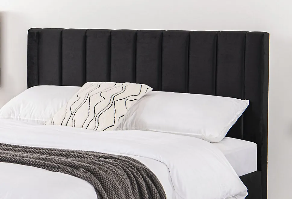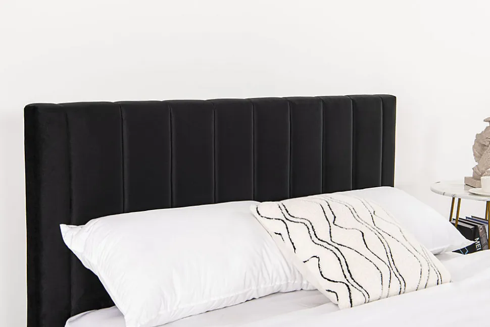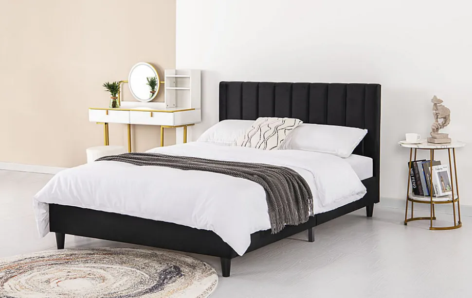 Ajoutez une touche de modernite à votre chambre avec ce joli lit de 160×200 cm avec un revêtement en velours ! Cette structure de lit apportera de l’elegance à votre chambre grâce à ses lignes epurees et son coloris sobre. Il vous offre tout le confort que vous pouvez rechercher grâce à sa tête de lit effet capitonne en velours.Caractéristiques techniques :Couleur lit : NoirCouleur pieds : NoirStructure : PlywoodNombre de lattes : 24 lattes en peuplierPieds : PlastiqueRevêtement : 100% polyesterFinition : VeloursPoids maximum supporte : 180 kgEntretien :Pour bien entretenir votre lit, utilisez un chiffon doux legèrement humide. N’utilisez pas de solvant.DimensionsStructure de lit : 214 x 165 x 101,5 cm / 38 kgTaille du couchage : 160 x 200 cmDimensions tête de lit : 165 x 8 x 90 cmNombre de latte : 24Conditionnement:Livre non monte, conditionne dans 1 carton. Notice de montage incluse.Colis : 169,5 x 15 x 91,5 / 41,5 kg