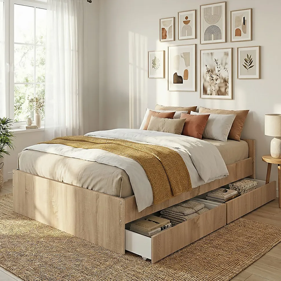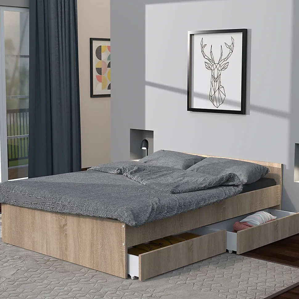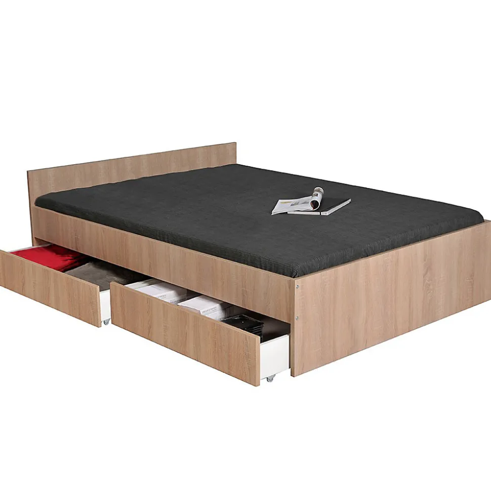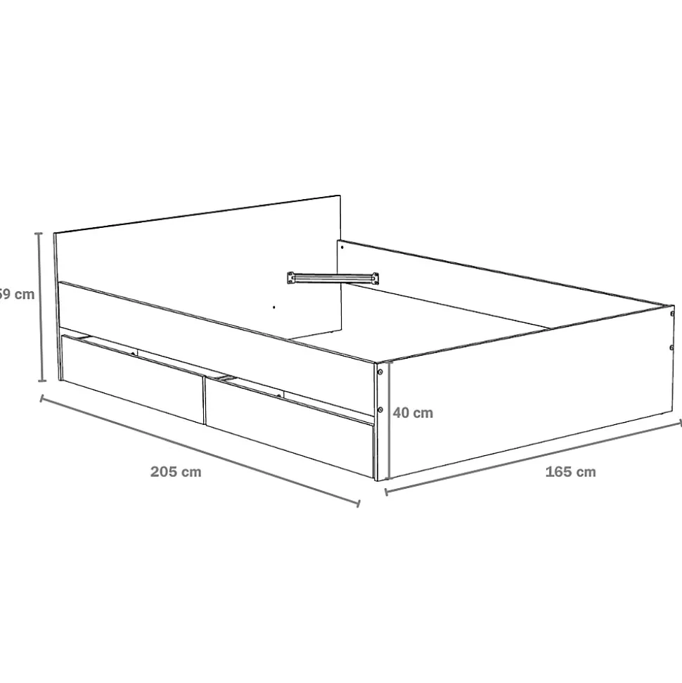 Lit rangement KAPPA 160 x 200 cmGrâce à son design moderne et intemporel, le lit KAPPA s’adapte à tous les types de chambre et de décoration. Disposant de deux tiroirs, il est très pratique pour ajouter du rangement dans la chambre principale sans encombrer la surface au sol. Votre linge de lit et vos affaires ont enfin leur place et sont rangés en un clin d’œil ! Les Plus produit : – 2 Tiroirs pratiques sur roulettes- Tête de lit intégréeCaractéristiques : Structure en panneau de particules, fond des tiroirs en MDF.Finition : Chêne Blanchi2 tiroirs de rangement montés sur roulettes.Hauteur avec la tête de lit : 59 cmLivré démonté, sans sommier, sans matelas, prévoir un sommier à cadre. A monter soi-mêmeDimensions:205x165x59