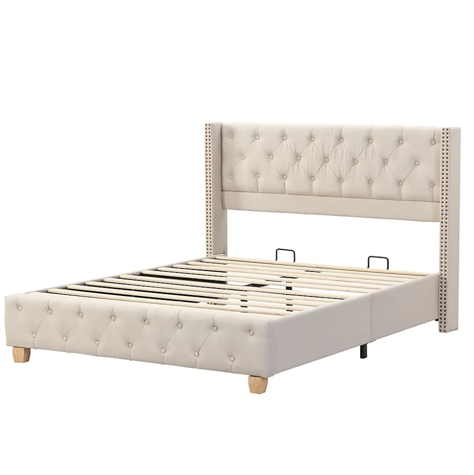 - Design élégant et naturel tapissé en lin beige, tête de lit capitonnée avec motifs à boutons et clous décoratifs sur les côtés; lignes douces et finition soignée pour une chambre harmonieuse.