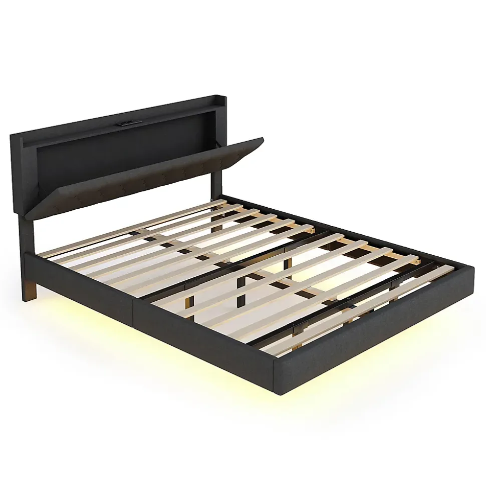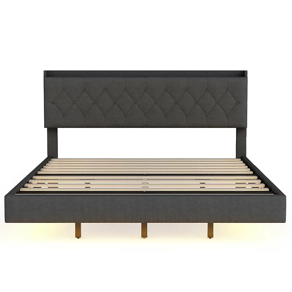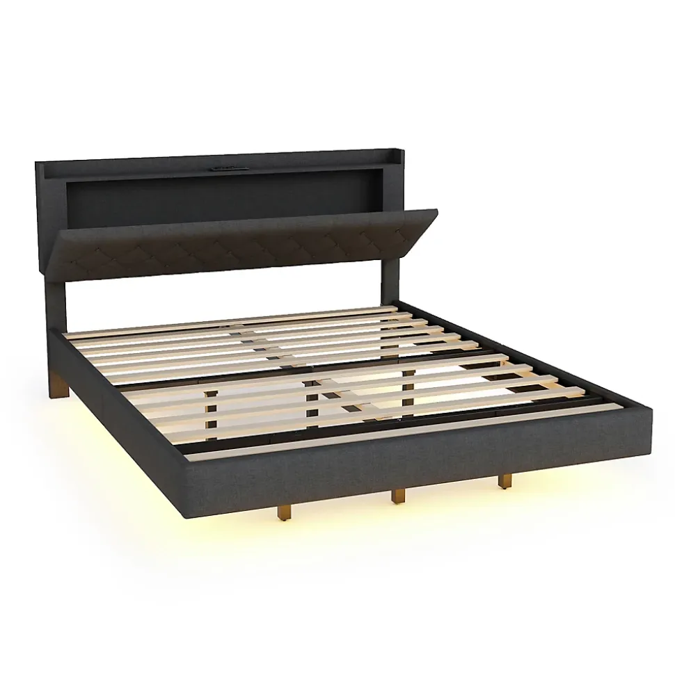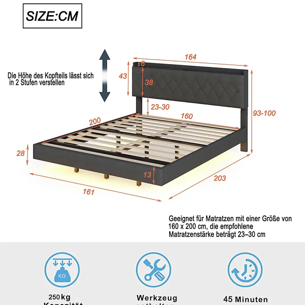 Design & styleCe lit 160×200 cm tapissé en tissu lin gris propose un look moderne et raffiné. La tête de lit réglable en hauteur s’adapte aux différentes épaisseurs de matelas et apporte un soutien confortable pour la lecture ou la détente. La finition sobre s’intègre facilement dans une chambre contemporaine.Fonctionnalité & rangement Bande LED multicolore discrètement intégrée sous le cadre, plusieurs modes d’éclairage pour personnaliser l’ambiance selon l’heure ou l’activité. Prise USB intégrée sur le cadre pour charger vos appareils sans chercher de prise murale. Coffre de rangement relevable côté table de chevet, pratique pour ranger linge, oreillers ou petits objets et garder la chambre ordonnée.Structure & confortCadre conçu avec une ossature métallique renforcée, panneaux MDF et contreplaqué, et 12 lattes pour un soutien homogène. Capacité de charge maximale 250 kg. Recommandation d’utilisation avec matelas d’une épaisseur comprise entre 23 et 30 cm pour un maintien adapté.Matériaux & entretienTissu tapissé en lin agréable au toucher, résistant à l’usure et facile d’entretien. Nettoyer avec un chiffon doux et éviter les produits abrasifs ou solvants. Les surfaces métalliques et panneaux peuvent être essuyés avec un chiffon légèrement humide.Installation & livraisonProduit livré en 2 colis (peuvent arriver séparément). Montage requis, deux personnes recommandées, durée estimée 2 heures. Tous les outils nécessaires sont fournis; l’utilisation d’outils électriques est déconseillée. Dimensions totales : 203x164x100 cm, poids total du colis environ 45 kg.
