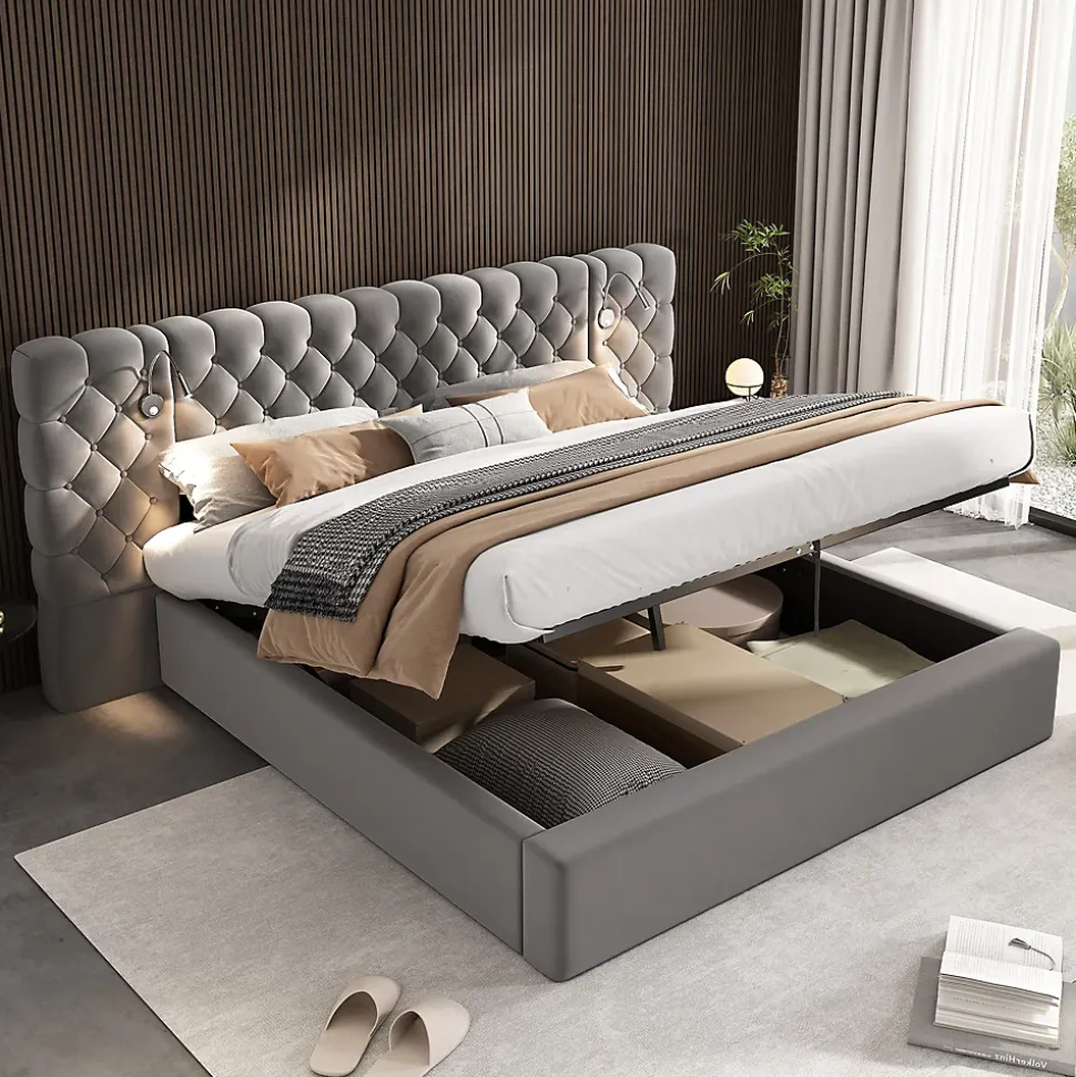 Design & style Ce lit 180×200 cm associe lignes modernes et finition en velours gris pour un rendu élégant et doux au toucher. La tête de lit capitonnée, large et confortable, intègre une liseuse discrète permettant de lire sans déranger l’ambiance générale de la chambre.Fonctionnalité & rangement Système de relevage hydraulique offrant un volume de rangement spacieux sous le sommier, idéal pour couettes, oreillers et linge hors saison. Sommier à lattes en bois inclus pour une bonne circulation de l’air et un soutien homogène du matelas. Conception adaptée pour un matelas 180×200 cm, charge admissible jusqu’à 300 kg et épaisseur maximale recommandée du matelas 26 cm.Matériaux & entretien Revêtement en velours gris de qualité, agréable et esthétique pour un intérieur contemporain. Structure et lattes en bois assurent solidité et durabilité. Pour l’entretien, nettoyer délicatement avec un chiffon doux et utiliser l’aspirateur à faible puissance si nécessaire.Installation & livraison Produit livré démonté en 3 colis pouvant arriver séparément; poids total env. 59,5 kg. Montage requis, deux personnes recommandées. Toutes les pièces et la notice sont fournies pour faciliter l’assemblage. Matelas non fourni.Usage & conseils Lit pensé pour optimiser l’espace et faciliter le quotidien : le coffre hydraulique libère de la place de rangement sans compromettre le confort. Convient aux chambres contemporaines ou sobres où le velours apporte une touche de chaleur. Origine produit: Chine.