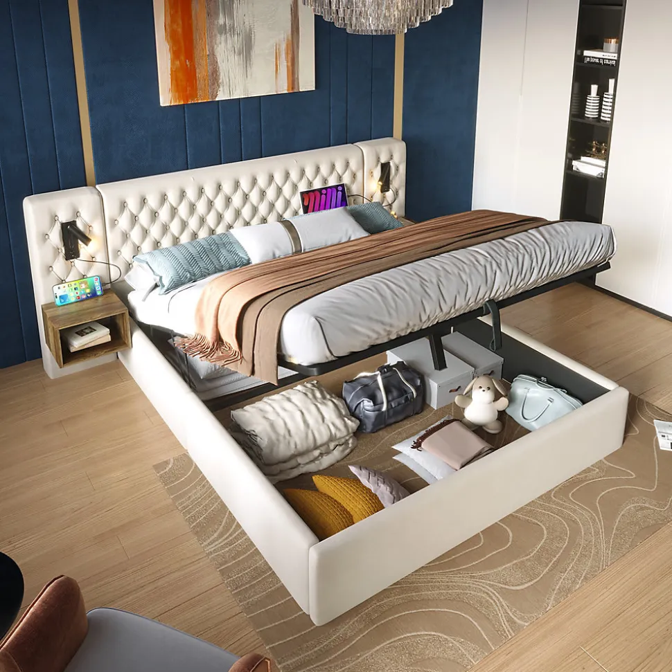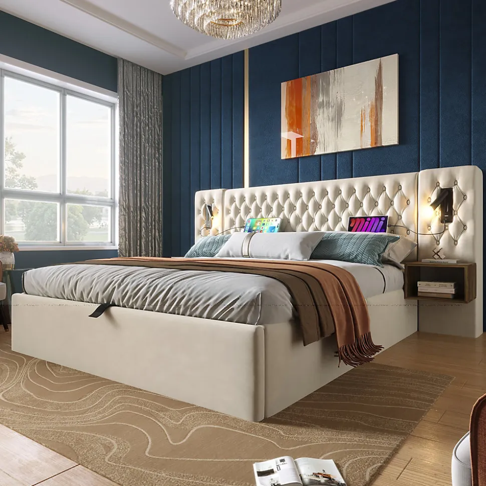 Design & styleCe lit propose un style rétro-chic avec une tête de lit rembourrée revêtue de velours beige, offrant un toucher agréable et une apparence chaleureuse. Les deux tables de chevet en finition bois créent un contraste élégant et soignent l’ambiance de la chambre sans surcharge décorative.Fonctionnalité & rangement Coffre de rangement hydraulique pour optimiser l’espace sous le matelas et accéder facilement à la literie et aux accessoires. Deux tables de chevet intégrées au montant de tête offrant une surface pratique pour lampe et objets du quotidien, capacité de charge 25 kg chacune. Conception pensée pour ranger efficacement tout en conservant un accès aisé au couchage.Matériaux & confortStructure avec cadre métallique laqué assurant la stabilité, lattes en bois massif pour un soutien orthopédique et réduction du risque d’affaissement. Bandes en EVA intégrées au châssis pour limiter les bruits d’usage. Revêtement en velours doux et résistant facilitant l’intégration dans différents styles de décoration.Dimensions & caractéristiques techniques Dimensions totales : 267x213x105 cm (L x P x H). Dimension lit compatible : 180×200 cm (matelas non fourni), épaisseur recommandée ≤27 cm. Dimensions intérieures des tables de chevet : 32x29x22 cm (L x P x H). Charge utilisateur maximale : 226 kg. Poids brut / net : 68,95 kg / 60,45 kg. Contenu du colis : cadre de lit, sommier à lattes et station de charge (USB & Type‑C). Boxspring non nécessaire.Installation & emballageMontage requis, notice et outils simples fournis ; deux personnes recommandées pour un assemblage sécurisé. Le produit est expédié en 3 colis pouvant arriver séparément afin de réduire le risque d’endommagement pendant le transport. En cas de pièces manquantes après réception, contacter le service client.EntretienNettoyage facile : dépoussiérage régulier et essuyage avec un chiffon doux. Éviter les produits agressifs pour préserver la couleur et la texture du velours.