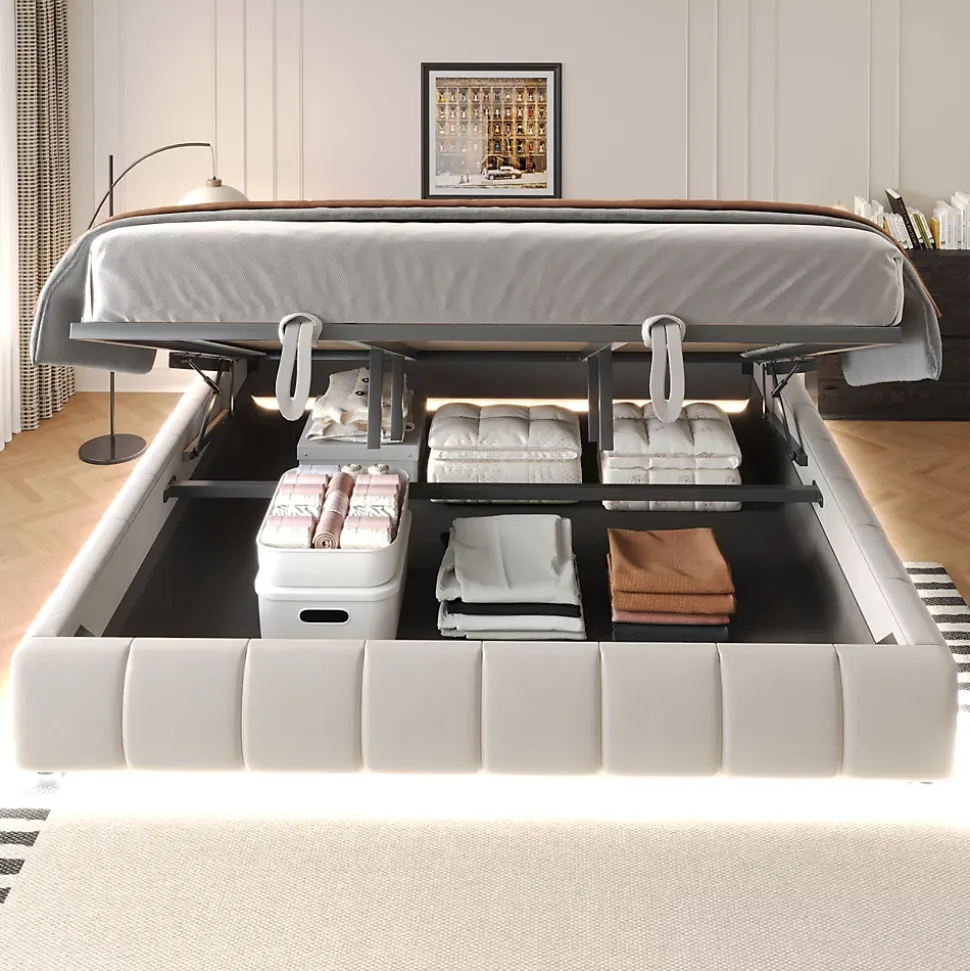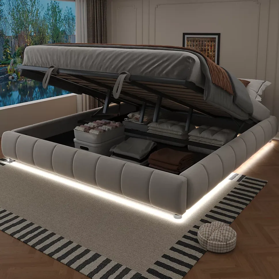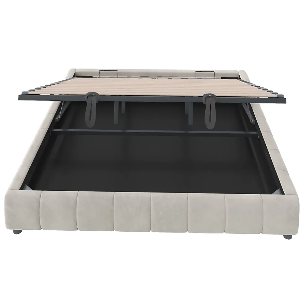 - Rangement hydraulique spacieux sous le sommier, facile à lever pour accéder au coffre. Cadre métal et sommier solide offrant une capacité de charge de 300 kg, adapté aux usages quotidiens.