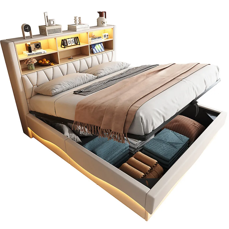 SpécificationsCouleur principale : BeigeMatériau principal : FerDimensionsLongueur assemblé (cm) : 221,00Largeur assemblé (cm) : 183,00Hauteur assemblé (cm) : 131,00Poids du produit (kg) : 62,00Dimensions du colisSous-article 1 :134,16 * 37,9 * 9,45 cm 16,02 kgSous-article 2 : 186.13 * 29.62 * 21.64 cm 30.36 kgSous-article 3 : 181.81 * 37.06 * 10.46 cm 23.56 kgCaractéristiques du produitÉclairage LED intelligent : bande lumineuse LED intégrée contrôlable via une application pour smartphone ou une télécommande. L’ambiance multicolore et la lumière de lecture chaude créent une atmosphère apaisante pour s’endormir.IDÉE DE RANGEMENT SCIENTIFIQUE : le lit est équipé d’un compartiment de rangement ouvert pour les livres, les jouets ou la literie afin d’optimiser l’espace. Le lit est équipé d’un dispositif de levage hydraulique qui permet d’ouvrir facilement le vaste espace de rangement sous le lit, idéal pour ranger la literie, les jouets ou les vêtements de saison.Structure métallique robuste : le sommier à lattes renforcé en métal offre une grande stabilité et une capacité de charge pour une sécurité durable.Housse en lin douce pour la peau : rembourrage complet du lit + lin respirant, coins arrondis sans bords durs, résistant aux chocs, facile d’entretien pour les activités quotidiennes.INTERFACE DE CHARGE USB : la table de chevet est équipée d’une prise USB qui permet de recharger facilement les téléphones portables, les lampes de bureau et autres appareils pendant la nuit.