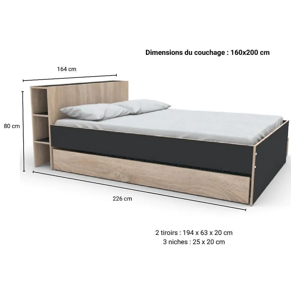 Optimisez la chambre de votre enfant grâce au lit . Son design compact offre plusieurs solutions de rangement : un véritable atout pour les petits espaces.Disposant de 2 tiroirs, il est très pratique pour ajouter du rangement dans la chambre principale sans encombrer la surface au sol. Votre linge de lit et vos affaires ont enfin leur place et sont rangés en un clin d’oeil !Matériel:Cadre : Structure en panneau de particulesFond de tiroir en MDF- Charge maximale : 110 kg.Sommier 2×22 Lattes en bois multiplis.Dimensions:Zone de couchage 160x200cmLongueur:226cmLargeur : 164cmHauteur : 80cmATTENTION le matelas et la décoration ne sont pas comprise dans la livraison.*Les couleurs réelles peuvent différer de ceux indiqué dans l’image en raison de la nature des paramètres de couleur de photographier et de moniteur.Support client et SAV en Français – Pas de livraison dans le DOM TOM et la Corse.**Attention la livraison est prévue au pied de l’immeuble ou de la maison et non à domicile.