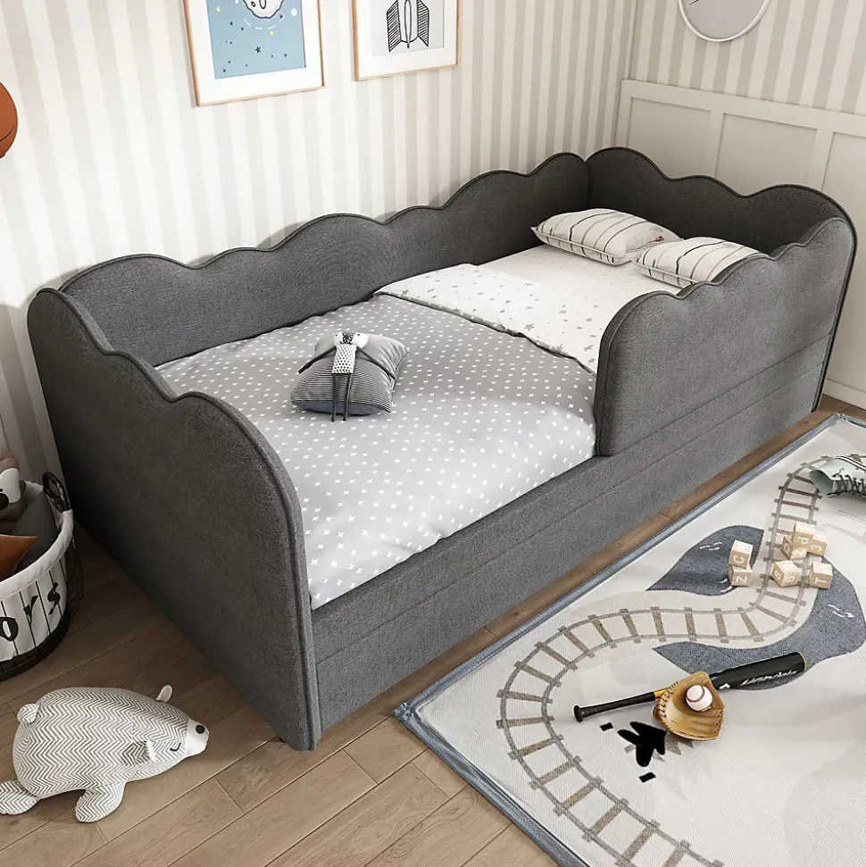 Design & styleCe lit 90×190 cm présente une silhouette douce en forme de nuage et un dossier rembourré pour un confort d’assise. Le revêtement en lin gris apporte une finition sobre et chaleureuse, idéale pour une chambre d’enfant ou une petite chambre d’ami. Les bords arrondis et la forme ergonomique réduisent les angles vifs pour limiter les risques de blessure.Fonctionnalité & rangement Lit principal et lit gigogne compatibles avec matelas 90×190 cm (matelas non fournis) ; la gigogne accepte de préférence une épaisseur de matelas inférieure à 13 cm pour un rangement optimal. Le châssis métallique du lit gigogne offre une assise stable et sûre, équipé de 6 roulettes avec frein pour la sécurité et de deux barres en U empêchant le déplacement du matelas pendant l’utilisation. Cadre en L avec côtés interchangeables et barrière avant amovible, permettant d’adapter la configuration selon l’âge de l’enfant ou l’aménagement de la pièce.Matériaux & entretienStructure composée d’éléments en panneaux et d’un cadre métallique pour la partie gigogne, rembourrage en mousse épaisse au dossier et tissu lin gris en finition. Charge maximale recommandée 150 kg. Surface facile à entretenir : dépoussiérage ou nettoyage local avec un chiffon légèrement humide, éviter les produits agressifs.Installation & emballageMontage requis, deux personnes conseillées. Produit livré en 2 colis (dimensions extérieures 99 x 197 x 70 cm une fois assemblé) ; les pièces sont numérotées et un outil simple ainsi qu’une notice sont fournis pour faciliter l’assemblage. Le lit ne nécessite pas de boxspring et est expédié en plusieurs colis pouvant arriver séparément. En cas de pièces manquantes, merci de contacter le service client.