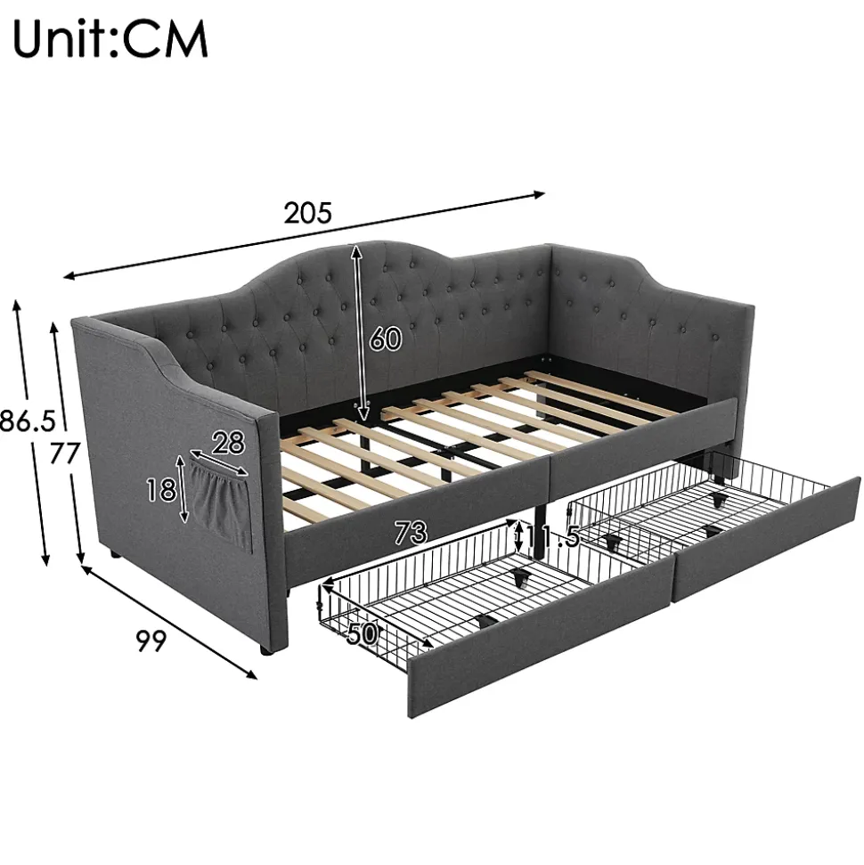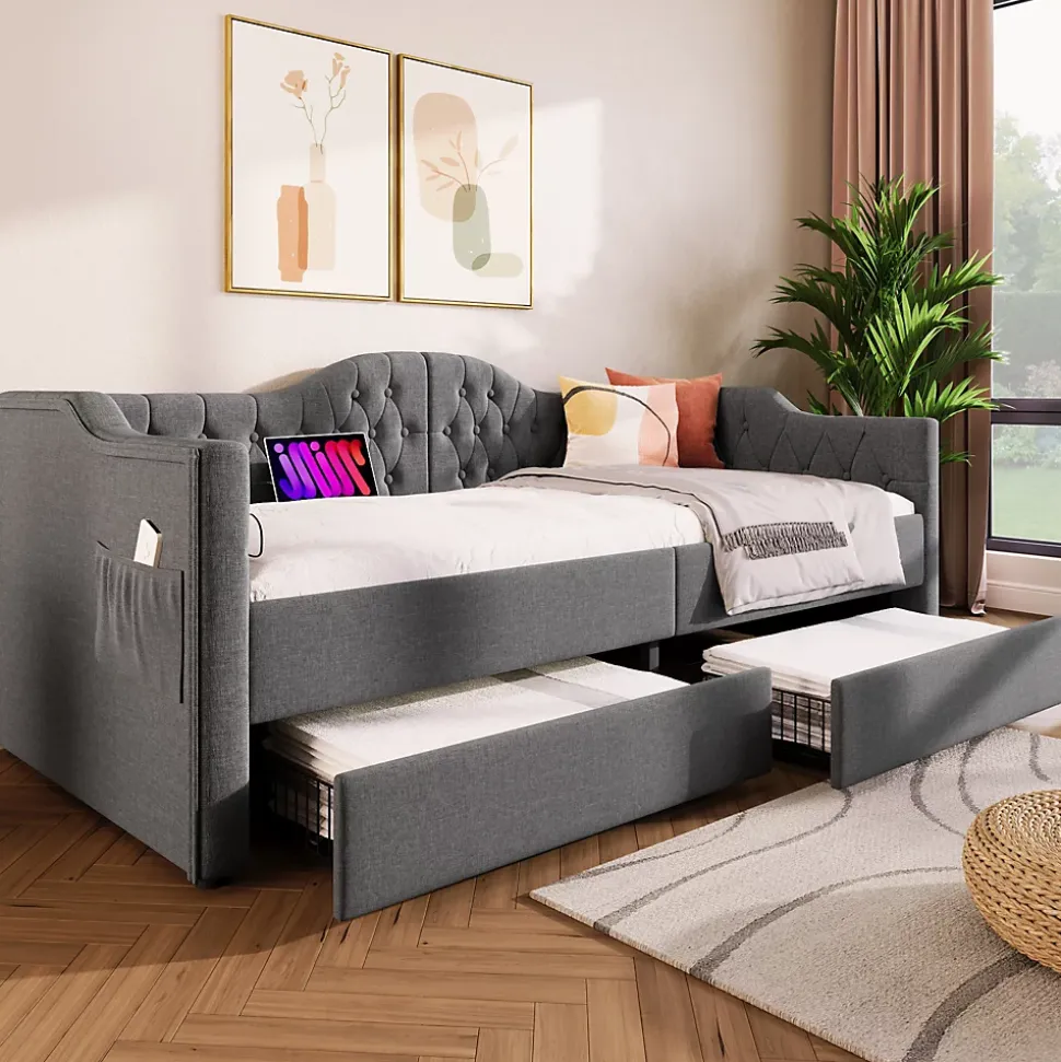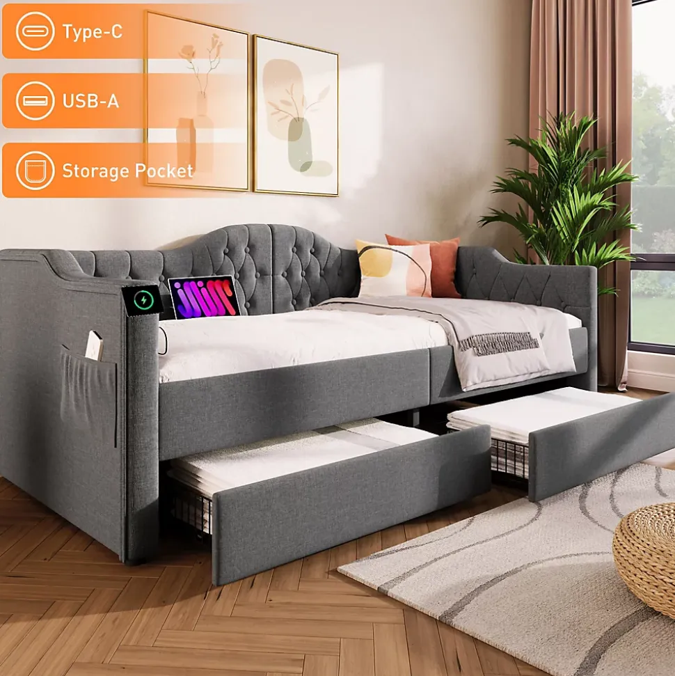 Design & styleCe lit 90×190 cm associe une tête de lit capitonnée au charme vintage et des accoudoirs aux formes douces, le tout tapissé d’un lin gris sobre. Sa silhouette étudiée apporte une présence discrète et chaleureuse qui s’intègre facilement aux décors contemporains ou scandinaves. Dimensions totales : 99x205x86,5 cm (LxlxH).Fonctionnalité & rangement Deux tiroirs intégrés sous le couchage pour organiser draps, couettes, vêtements et jouets. Deux poches latérales pratiques pour télécommande, téléphone et magazines afin de garder les essentiels à portée de main. Ports de charge intégrés (USB et USB‑C) situés près de l’accoudoir pour alimenter appareils sans rechercher une prise murale.Matériaux & entretienStructure combinant acier, bois massif et panneaux MDF pour une stabilité adaptée à un usage quotidien. Accoudoirs et dossier garnis de mousse haute densité recouverts de tissu lin gris pour un confort soutenu. Charge maximale recommandée : 158 kg (350 lb). Entretien facile : surfaces textiles à dépoussiérer et taches ponctuelles à nettoyer avec un chiffon humide doux.Installation & emballageMontage requis, deux personnes conseillées pour un assemblage sûr. Produit livré en 2 colis pouvant arriver séparément. Poids brut/net : 49,5/42,7 kg. Contenu du colis : châssis de lit avec tiroirs, ports USB/Type‑C et accessoires de montage. Notice de montage fournie et disponible en ligne.
