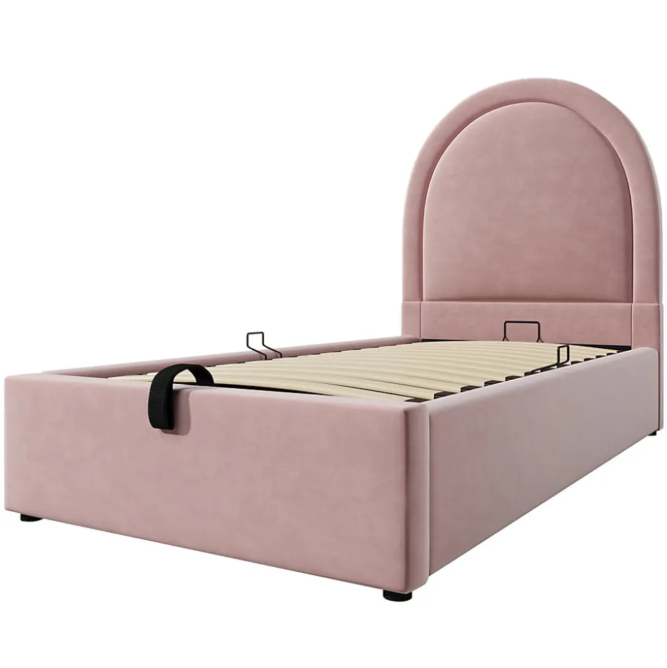 - Design élégant avec tête de lit demi‑cercle tapissée de velours rose; finition douce et chaleureuse qui apporte une atmosphère confortable et contemporaine à la chambre d’un enfant.