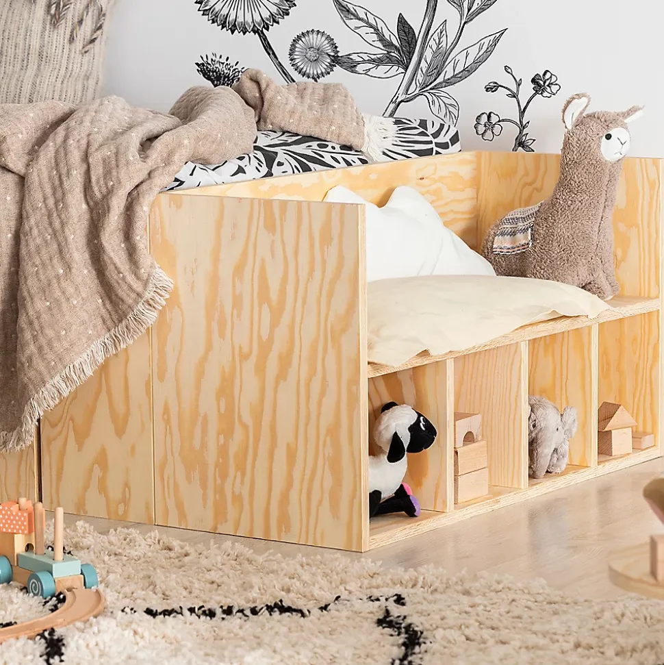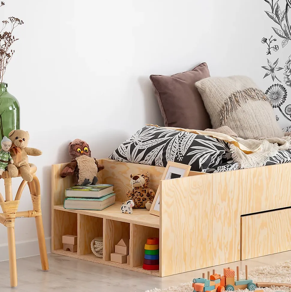 - Lit : A partir de 4 ans – Poids maximum conseillé : 90 kg – Etagères et cases de rangement sur le côté du lit – Sommier à lattes inclus