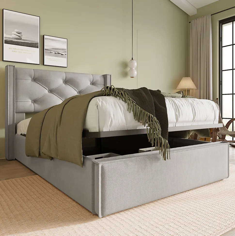 Design & styleCe canapé-lit présente une silhouette soignée avec un large dossier capitonné et une profondeur de matelassage qui lui confère un rendu rétro moderne. Le revêtement en coton gris clair offre une finition douce et une esthétique sobre, dimensions totales 203x101x110 cm pour une bonne présence dans la chambre ou le séjour.Fonction coffre & conversionSommiers à lattes relevables assistés par vérins permettant un accès aisé au grand coffre de rangement.Espace intérieur utile 83×193 cm, idéal pour ranger couettes, oreillers et linge de maison ; fond en tissu Oxford pour limiter la poussière.Livré en plusieurs colis (3) pouvant arriver séparément ; vérifier le contenu avant montage.Matériaux & confortStructure combinant bois massif et métal pour une solidité durable ; lattes en pin élastiques garantissent un soutien harmonieux et prolongent la durée de vie du matelas compatible 90×200 cm (matelas non fourni). Les textiles utilisés sont testés selon la norme Oeko-Tex Standard 100 et conviennent aux personnes sensibles.Entretien & sécuritéBandes antidérapantes au niveau des lattes pour limiter le glissement du matelas et bordures en matériau souple pour réduire le risque de chocs. Entretien simple : aspiration régulière et nettoyage local avec un chiffon humide. Convient aux personnes sensibles à la poussière grâce à la ventilation et au fond protégé du coffre.Montage & livraisonMontage requis, deux personnes recommandées. Produit expédié en 3 colis pour réduire les risques de dommage ; si des pièces manquent après réception de tous les colis, contacter le service client. Charge maximale utilisateur indiquée jusqu’à 150 kg selon modèle et réglages.