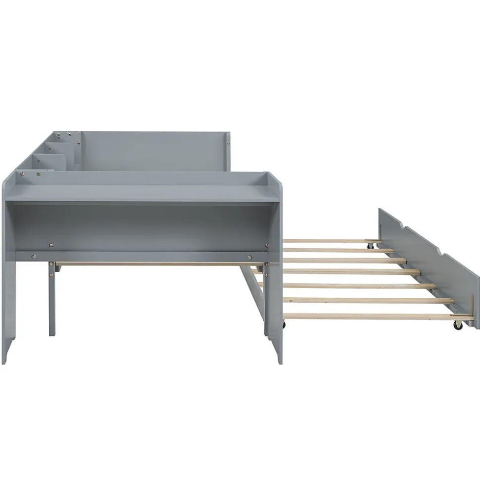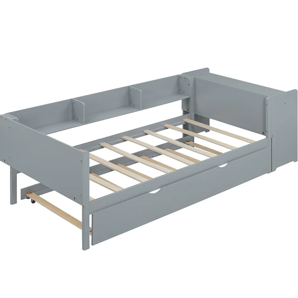 Design & styleCe lit 90×200 cm associe un style moderne et des lignes pensées pour l’univers enfant : finition gris neutre, structure apparente en pin massif et faces en MDF pour un aspect soigné et chaleureux. La hauteur totale de 73 cm et les proportions sont étudiées pour s’intégrer facilement dans une chambre d’enfant tout en apportant une silhouette contemporaine et douce.Fonctionnalité & rangement Lit gigogne escamotable pour accueillir un couchage supplémentaire : intérieur du tiroir 90 x 180 cm, capacité 80 kg, recommandé pour une épaisseur de matelas de 10 cm. Bureau intégré et amovible pouvant être positionné à la tête ou au pied du lit pour créer un coin travail ou lecture pratique et gain de place. Trois étagères latérales pour ranger livres, jouets et accessoires et favoriser l’ordre dans la chambre.Matériaux & entretienStructure en pin massif combinée à des éléments en MDF pour une bonne résistance et une surface lisse. Nombre de lattes : 8. Capacité maximale du couchage principal : 140 kg. Recommandation d’épaisseur de matelas pour le couchage principal : 15–20 cm. Pour l’entretien, utiliser un chiffon doux et sec ou légèrement humide ; éviter les produits abrasifs ou corrosifs afin de préserver les finitions.Installation & emballageProduit fabriqué au Vietnam, livré depuis l’Europe en 2 colis (les colis peuvent arriver séparément). Montage requis, deux personnes recommandées pour assurer la stabilité et la sécurité de l’assemblage. Le mobilier est conçu pour un usage quotidien et pour optimiser l’espace dans une chambre d’enfant.