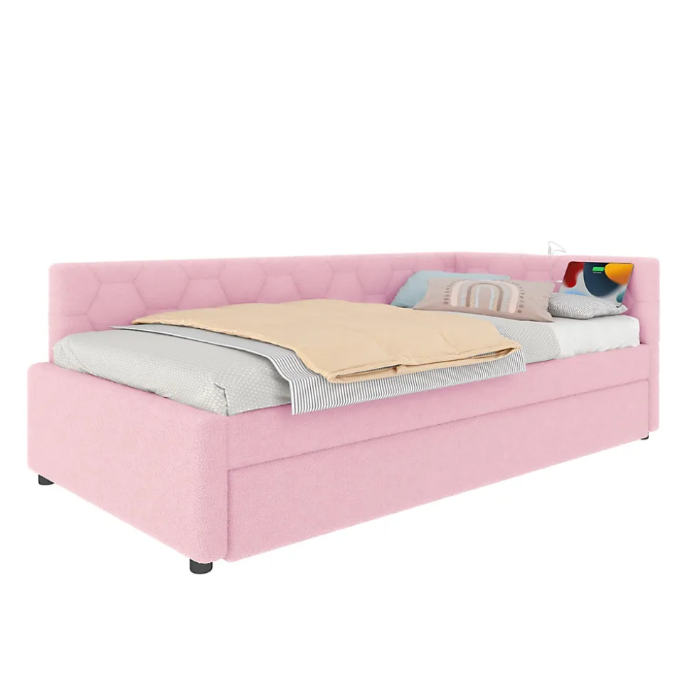 Design & styleCe lit 90×200 cm associe un revêtement en velours doux à un motif géométrique discret pour créer un nid chaleureux et moderne dans la chambre d’un enfant. Les lignes épurées et la finition MDF apportent une esthétique sobre et harmonieuse, facile à intégrer dans différents décors.Fonctionnalité & rangementConçu comme un daybed multifonctionnel, il se transforme en un geste grâce à son lit gigogne coulissant, offrant un couchage supplémentaire sans encombrer l’espace. Le lit intègre également une lampe de chevet diffusant une lumière chaude, ainsi que des ports USB et Type‑C pour recharger tablettes et appareils électroniques en toute simplicité.Matériaux & confortRevêtement en velours (vliesimitat) agréable au toucher, structure en MDF pour une tenue stable. Intérieur du lit : 90 x 200 cm. Recommandation d’épaisseur de matelas pour le lit principal : 10–15 cm. Le sommier et la conception garantissent un confort quotidien adapté aux besoins des enfants.Caractéristiques techniques Dimensions extérieures approximatives : 208 x 95 x 66,5 cm Dimensions intérieures du couchage : 90 x 200 cm Lit gigogne intérieur : 89,5 x 188 cm, capacité 80 kg, matelas recommandé 10 cm Capacité du lit principal : 150 kgInstallation & emballageMontage requis, deux personnes conseillées. Produit livré en 2 colis qui peuvent arriver séparément ; prévoir de la patience lors de la réception. Entretien simple : dépoussiérer et nettoyer le velours avec un chiffon doux, éviter les produits agressifs.