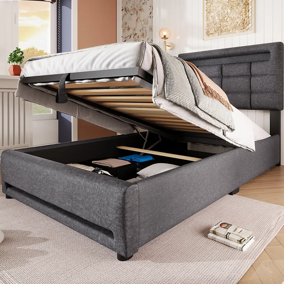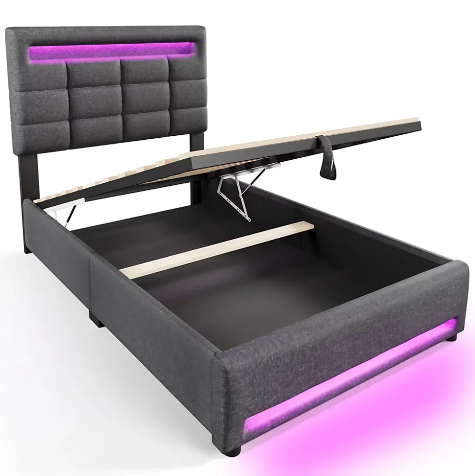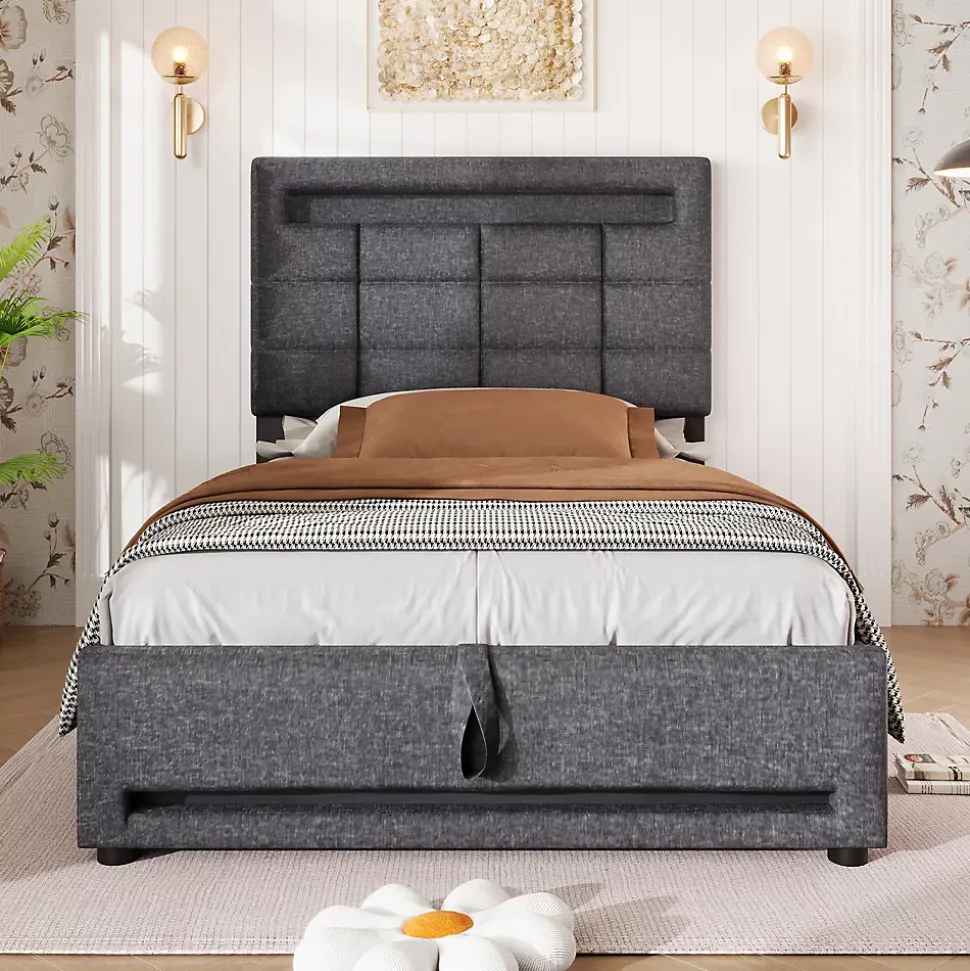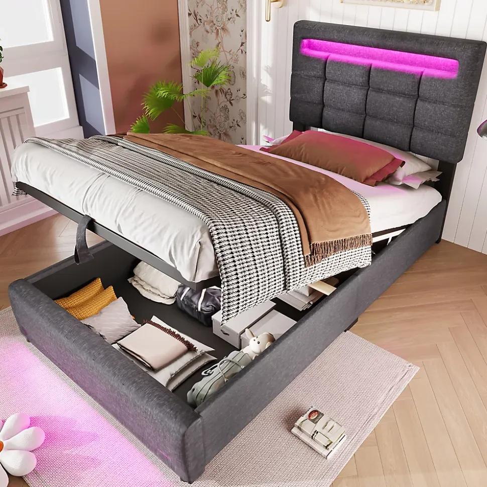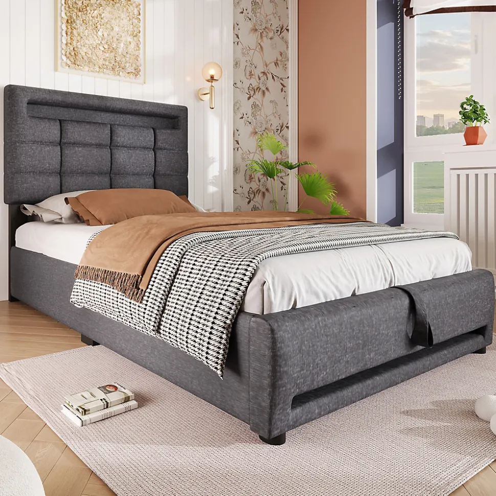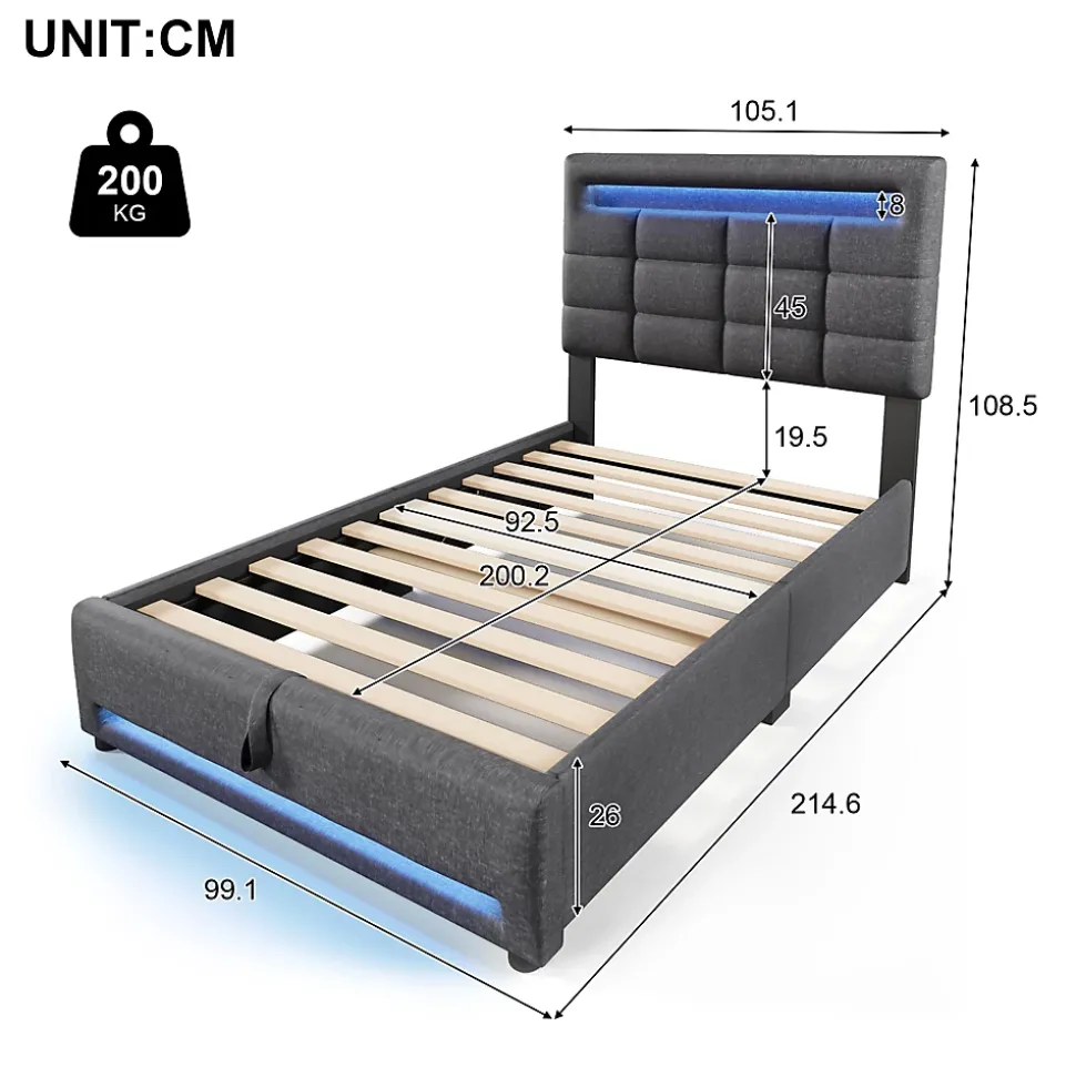 Design & styleCe lit tapissé en lin gris associe une touche naturelle et une silhouette contemporaine. La tête de lit à motifs carrés apporte du caractère sans surcharger l’espace, tandis que la finition soignée garantit une intégration harmonieuse dans une chambre moderne.Fonctionnalité & rangement Sommier relevable avec mécanisme hydraulique caché offrant un vaste volume de rangement sous le lit pour draps, couettes et rangements saisonniers. Bande lumineuse d’ambiance LED autour de l’extrémité du lit, 16 couleurs réglables via l’application mobile pour créer différents ambiances nocturnes. Prise USB intégrée au cadre pour recharger facilement téléphone et appareils au chevet.Matériaux & entretienRevêtement en lin agréable au toucher et structure en panneaux MDF garantissant stabilité et confort. Capacité de charge maximale 200 kg. Surface traitée, se nettoie simplement avec un chiffon doux et sec ou légèrement humide selon les taches.Installation & emballageMontage requis, recommandé à deux personnes. Produit livré en 2 colis, pouvant arriver séparément. Dimensions totales : 214,6 x 99,1 x 108,5 cm ; intérieur du couchage : 90 x 200 cm. Épaisseur de matelas recommandée : 15–20 cm. Origine : Vietnam. En cas de question pendant l’installation, référez-vous au guide ou contactez le service client.