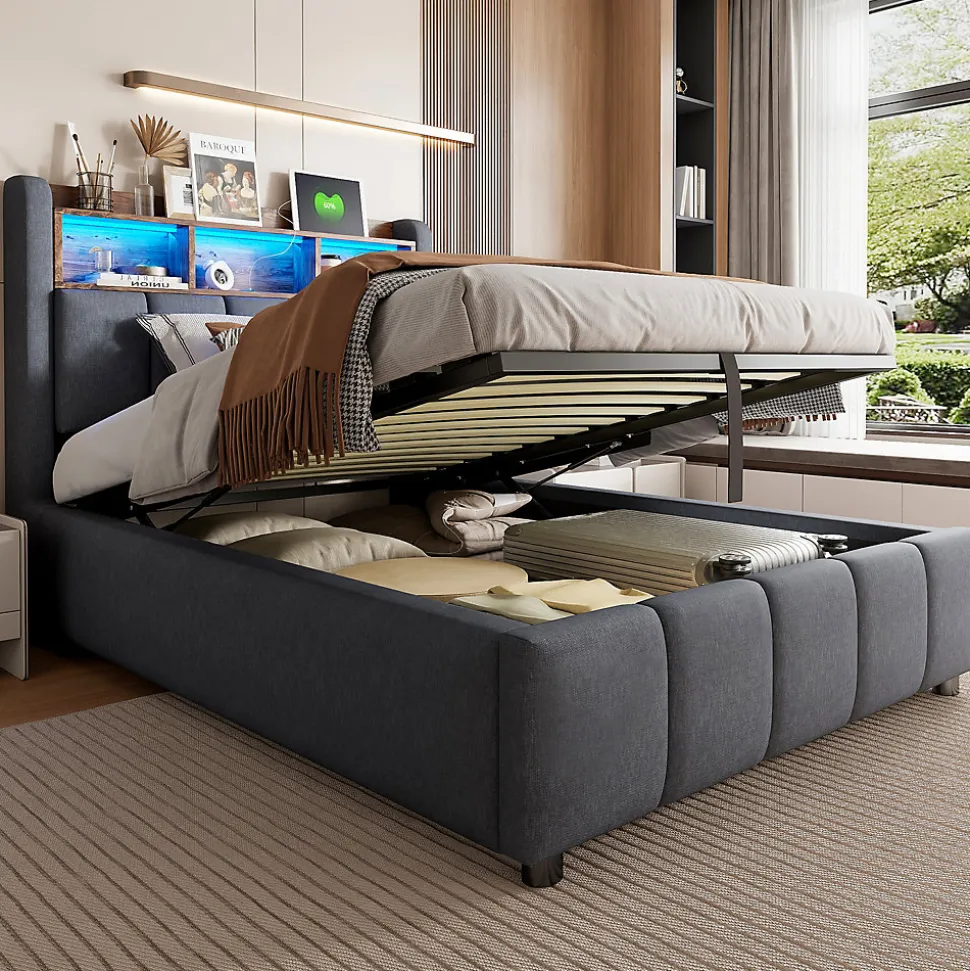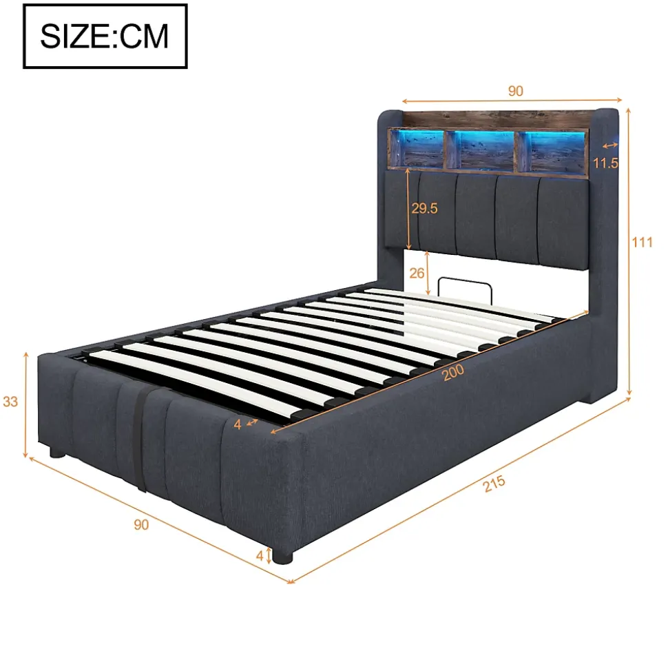Design & style Ce lit associe lignes épurées et finitions soignées : revêtement en tissu lin gris résistant, tête de lit avec étagères pratiques et éclairage led multicolore intégrable pour adapter l’ambiance selon vos envies.Fonctionnalité & rangement Le mécanisme hydraulique soulève facilement le sommier pour accéder à un grand espace de rangement sous le lit, idéal pour couettes, oreillers et vêtements. Le rangement de tête de lit permet d’organiser livres et appareils, tandis que les ports usb et type‑c facilitent la recharge au chevet.Matériaux & solidité Structure solide avec cadre métal et renforts en contreplaqué/mdf, 24 lattes pour un soutien homogène. Les larges pieds latéraux améliorent la stabilité et la durabilité ; tissu lin traité pour résister à l’usure et aux taches au quotidien.Confort & entretien Conçu pour recevoir un matelas 90×200 cm d’une épaisseur recommandée de 24–26 cm. Surface agréable au toucher, entretien facile avec un chiffon doux et des produits non abrasifs afin de préserver l’aspect du revêtement.Installation & livraison Montage complet requis, deux personnes recommandées, temps estimé environ 2 heures. Outils inclus (tournevis), évitez l’usage d’outils électriques. Dimensions totales : 215x90x111 cm. Poids produit : 34 kg, poids colis total : 39 kg, capacité de charge : 200 kg, livré en 2 colis.