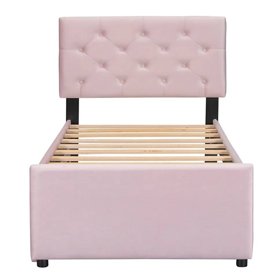 Design & styleCe lit tapissé en velours rose associe douceur et élégance pour une chambre accueillante. La tête de lit capitonnée avec boutons apporte un détail raffiné et romantique, tandis que la silhouette aux lignes sobres s’intègre dans un intérieur moderne ou enfantin.Fonctionnalité & rangement Tiroir roulant multifonction, positionnable à gauche ou à droite selon l’agencement de la chambre ; possibilité d’ajuster le tiroir à la même hauteur que le lit principal pour étendre la surface de couchage. Sommier à lattes (20 lattes) inclus, intérieur du couchage 90 x 200 cm. Tiroir intérieur : 90 x 190 cm. Capacité de charge : lit principal 150 kg, tiroir roulant 100 kg. Recommandation d’épaisseur de matelas : 10–15 cm pour le lit principal, 10 cm pour le lit roulant (matelas non fourni).Matériaux & entretienStructure en panneaux MDF et revêtement en velours (flanelle) pour une bonne tenue et une apparence chaleureuse. Finitions soignées qui soulignent l’esthétique. Entretien facile : nettoyage avec un chiffon doux et sec ou légèrement humide selon les taches.Installation & livraisonMontage requis, 2 personnes recommandées ; kit et notice fournis pour un assemblage guidé. Produit livré en 2 colis pouvant arriver séparément. Dimensions approximatives du produit assemblé : 209 x 105 x 104 cm. Fabrication d’origine Vietnam. Veuillez noter de légères variations dimensionnelles (±2–3 cm) et possibles différences de teinte selon l’éclairage.