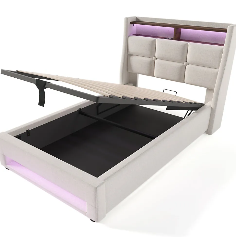 - Design vintage-moderne en tissu lin beige avec panneaux imitation bois et tête capitonnée rembourrée en mousse haute densité; éclairage LED multicolore discret pour une ambiance personnalisable.