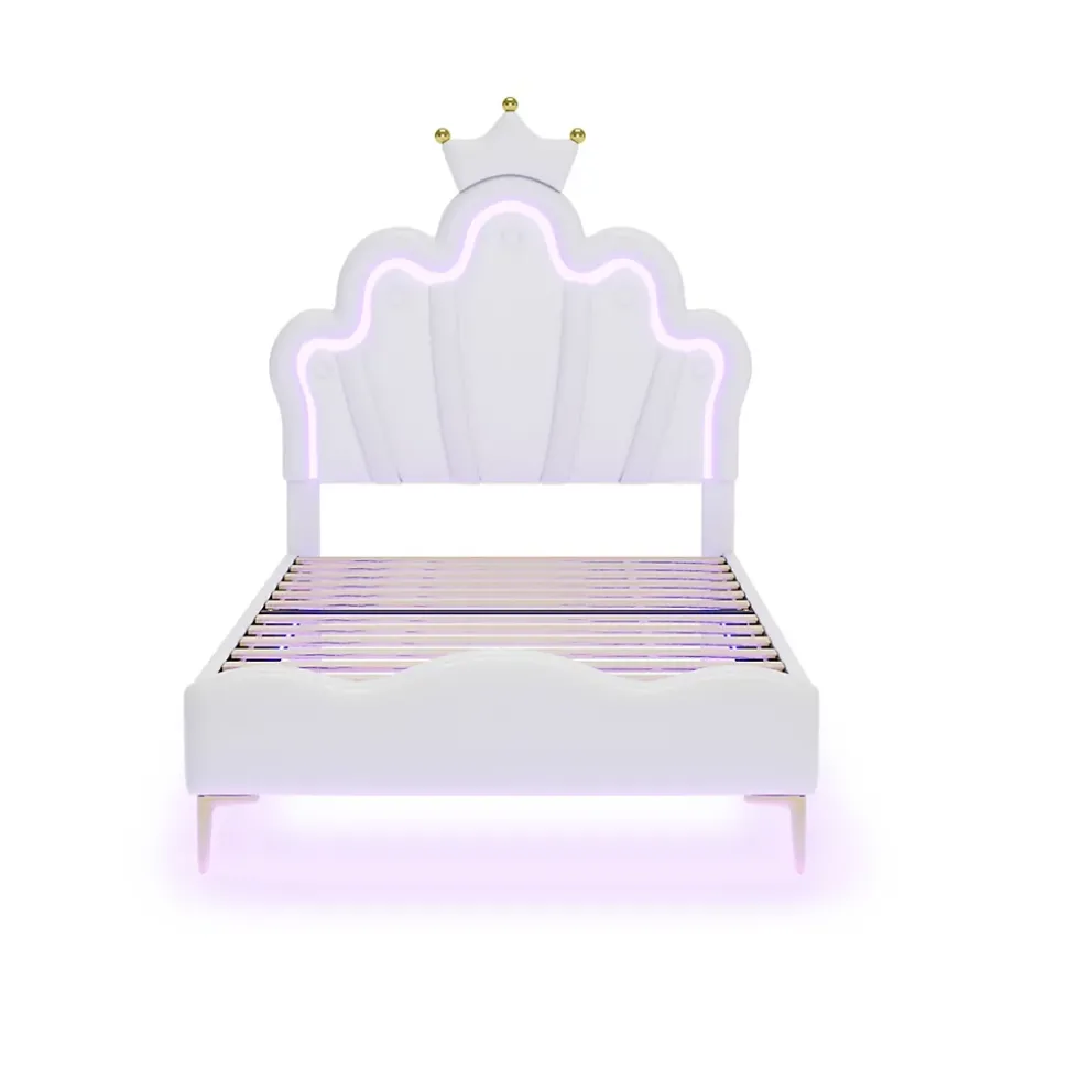 Design & style Ce lit 90×200 cm se distingue par une silhouette inspirée des nuages et une tête de lit couronnée, rehaussée d’un léger détail rose et perles décoratives. Tapissé en PU blanc, il apporte une touche élégante, douce et romantique qui s’intègre aux ambiances contemporaines ou plus classiques sans surcharger la pièce.Fonctionnalité & éclairage Le cadre et la tête de lit sont équipés de bandes LED RVB réglables, commandes via application pour varier couleurs et intensité et créer une atmosphère ludique ou apaisante. Le sommier comprend 12 lattes pour un soutien homogène et une meilleure ventilation du matelas.Matériaux & sécurité Structure en MDF et éléments métalliques pour une bonne résistance ; revêtement en PU résistant à l’eau et facile à entretenir. Charge maximale recommandée : 150 kg. Conception étudiée pour un usage quotidien et pour résister aux sauts occasionnels des enfants.Dimensions & compatibilité Dimensions extérieures approximatives : 203 x 90 x 129 cm (L x l x H). Dimensions intérieures pour matelas : 90 x 200 cm. Hauteur totale ajustable : 123 ou 129 cm ; convient aux matelas de 15 à 25 cm d’épaisseur selon le réglage choisi.Installation & emballage Produit livré en 1 colis avec notice détaillée et tous les éléments nécessaires ; montage requis, deux personnes recommandées ; temps estimé : environ 30 minutes. Emballage adapté pour livraison à domicile ; certaines pièces et accessoires inclus dans le colis.