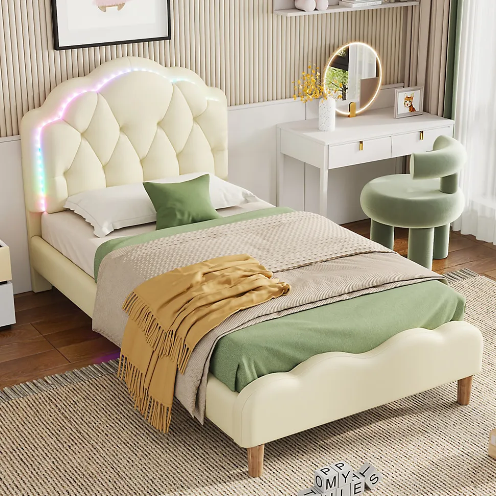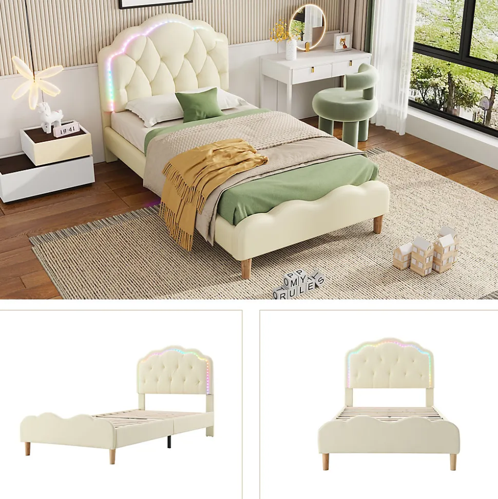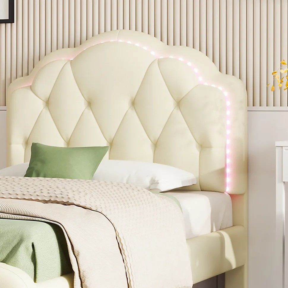 - Design élégant en PU beige avec une tête de lit ondulée et une bande LED multicolore intégrée : ambiance ludique et adaptée aux chambres d’enfant, sobre et harmonieuse.