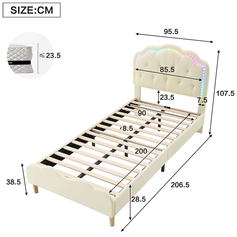 Design & styleCe lit tapissé en PU de couleur beige associe une silhouette contemporaine à une touche ludique grâce à sa tête de lit ondulée équipée d’une bande LED multicolore intégrée. Les variations lumineuses et les effets animés apportent une atmosphère chaleureuse et créative, tout en conservant une allure sobre qui s’intègre à divers styles de chambre.Fonctionnalité & stabilité Cadre avec lattes en bois assurant un soutien régulier du matelas (matelas non inclus). Quille métallique en base pour renforcer la stabilité et répartir les charges de façon homogène. Conçu pour un matelas 90×200 cm (épaisseur recommandée ≤23,5 cm) ; capacité de charge 136 kg. Dimensions totales : 206,5×95,5×107,5 cm ; poids net du produit : 22 kg.Matériaux & entretienRevêtement en PU facile à intégrer dans une décoration neutre. Pour l’entretien, utiliser un chiffon doux ou une brosse souple pour retirer poussière et saletés. Éviter les brosses dures ou produits agressifs. En cas de liquide renversé, essuyer immédiatement avec un tissu absorbant.Installation & emballageMontage requis : notice et pièces complètes fournies, deux personnes recommandées pour une installation sûre et rapide. Produit livré en 1 colis. Matelas non inclus. Pays d’origine : Chine. En raison des variations d’éclairage, de légères différences de couleur entre les photos et le produit réel peuvent apparaître.