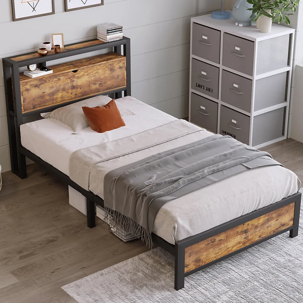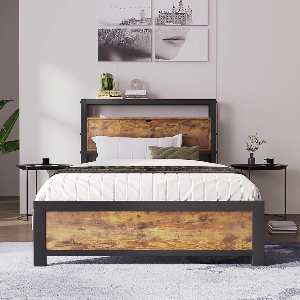 Design & styleCe lit 90×200 cm combine une esthétique industrielle et rustique grâce à l’association d’un cadre en métal et de panneaux bois à finition naturelle. La tête de lit intègre des étagères et deux niveaux de présentation pour organiser livres et objets décoratifs sans encombrer la chambre.Fonctionnalité & rangement Étagères intégrées dans la tête de lit pour ranger petits objets et téléphone. Espace sous-lit de 26,5 cm permettant de glisser des boîtes de rangement pour vêtements saisonniers ou chaussures. Conception pensée pour faciliter le nettoyage grâce au dégagement au sol.Matériaux & soliditéStructure en métal avec plateau renforcé, panneaux MDF pour les parties boisées. La plateforme est réalisée par soudure et assemblée avec des vis renforcées. Le sommier à 12 lattes métalliques et les 6 pieds indépendants offrent une capacité d’utilisation jusqu’à 120 kg. Dimensions totales : 100x216x95 cm (LxP xH). Matelas 90×200 cm non inclus.Installation & livraisonProduit livré en un colis plat pour faciliter le transport et la manutention. Montage requis, guide pas à pas fourni ; deux personnes sont recommandées pour l’assemblage. Toutes les pièces sont incluses dans la livraison et l’emballage permet une réception en un seul colis.