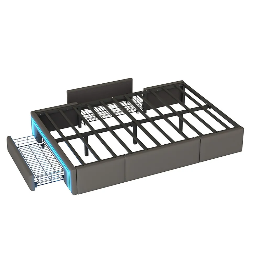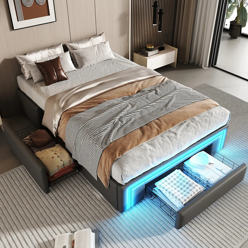 Design & styleCe lit 90×200 cm combine un design moderne et discret, habillé d’un revêtement en PU‑cuir gris pour une allure élégante et contemporaine. L’absence de tête de lit offre la liberté de personnaliser l’ensemble avec un élément adapté à votre intérieur, du plus minimaliste au plus chaleureux.Fonctionnalité & rangement Plusieurs tiroirs intégrés sous le couchage pour optimiser l’espace et ranger linge, couettes ou accessoires de saison. Solution pratique pour les petites chambres ou pour ceux qui cherchent à réduire l’encombrement sans compromettre le confort. Conception qui facilite l’accès au rangement tout en gardant un look épuré.Matériaux & entretienStructure composée d’un cadre métallique et d’un système de lattes robustes, associée à une garniture en PU‑cuir résistante. Capacité de charge jusqu’à 200 kg. Finitions lisses faciles à entretenir : essuyer avec un chiffon doux et éviter les produits abrasifs ou les solvants.Éclairage & expérienceBande LED RGB intégrée au pied de lit, réglable par télécommande pour ajuster la couleur et l’intensité selon l’ambiance souhaitée, utile pour la lecture ou pour créer une atmosphère détendue le soir.Installation & emballageMontage complet requis, estimé à environ 1 heure avec deux personnes. Le produit est livré en 1 colis. Outils courants fournis, évitez l’usage d’outils électriques puissants. Vérifiez les dimensions (200 x 90 x 32 cm) et l’épaisseur de matelas recommandée (22–25 cm) avant installation.Usage & compatibilitéAdapté à un style moderne, industriel ou minimaliste, ce lit tapissé offre une base stable et fonctionnelle pour aménager une chambre avec confort et rangement intégré, sans nécessiter de sommier supplémentaire.