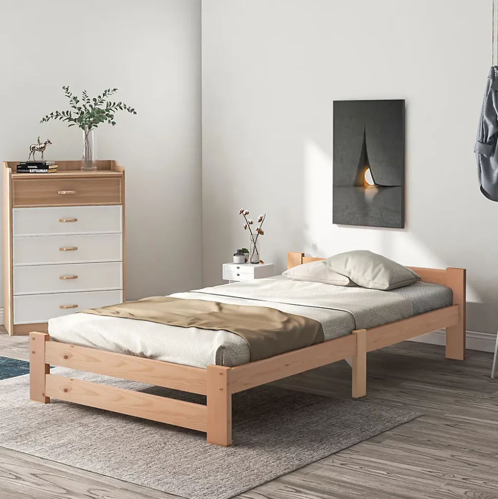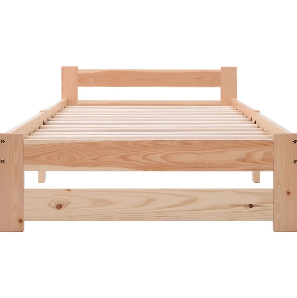 Description Aspect exceptionnel : tous les composants sont parfaitement assortis. Les indentations dans la surface du lit assurent une ventilation optimale, tandis que le bois peut être traité et personnalisé à votre guise. Profitez de l’aspect merveilleux de ce lit en bois massif fait de bois naturel de haute qualité. Apportez la tendance directement dans votre maison : les lits en bois massif font fureur en ce moment, ce lit en bois massif simple et durable dispose d’une structure en pin massif, de pieds et d’un cadre en bois massif. Simple et silencieux : le lit vous offre tout le confort et le soutien dont vous avez besoin sans les fioritures inutiles d’un lit traditionnel. Ses lignes simples et élégantes créent une atmosphère paisible et le lit complète de nombreux styles et intérieurs différents. Vous obtenez toujours une bonne nuit de sommeil, c’est de cela qu’il s’agit! S’adapte à toutes les pièces : le lit indestructible 90×200 cm est le lit simple idéal, le lit d’appoint compact avec une hauteur confortable de 49 cm. Pour votre maison ainsi que les hôtels et chambres d’hôtes. Testé, le lit en bois ne grince pas sous charge. Bonne taille : avec sa taille, le lit convient également aux petites pièces, aucun sommier à lattes supplémentaire n’est nécessaire, car le matelas est directement sur le lit.Détails du produit Taille totale : 205x97x49cm Poids total : 15 KG Matelas assortis (cm) : 200x90cm Capacité de charge (kg):150KG Couleur principale : Naturel Matériau principal : Bois