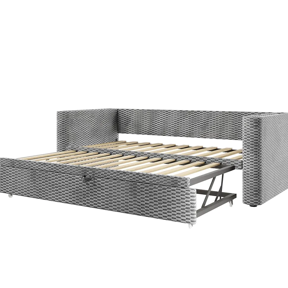 Design & styleCe lit combine un revêtement en velours gris et une structure en MDF pour offrir une sensation de confort et une esthétique raffinée. Les lignes épurées et les finitions soignées s’intègrent facilement dans un intérieur contemporain, chambre d’amis ou chambre d’enfant.Fonctionnalité & couchage Solution 2-en-1 : couchage principal 90×200 cm pouvant se convertir rapidement en un lit double 180×200 cm, idéal pour optimiser les petits espaces. Mécanisme d’extension manuel conçu pour une utilisation simple et sécurisée, adapté aux adultes comme aux enfants. Bonnets de charge et recommandations : capacité jusqu’à 150 kg et épaisseur de matelas recommandée 10 cm (matelas non inclus).Matériaux & entretienRevêtement en velours doux et structure en panneaux MDF pour un bon compromis entre tenue et confort. Pour l’entretien, dépoussiérer régulièrement et nettoyer avec un chiffon doux ; éviter les produits agressifs pour préserver la couleur et la texture du tissu.Dimensions & informations techniquesDimensions principales du produit assemblé : environ 229 x 191 x 68 cm. Dimensions du couchage : 90×200 cm (usage standard) et 180×200 cm une fois déployé. Intérieur du couchage extensible environ 90×190–200 cm selon position. Poids supporté : 150 kg.Installation & emballageMontage requis, deux personnes recommandées. Le produit est expédié en 3 colis qui peuvent arriver séparément ; prévoir un espace suffisant pour l’assemblage. Attention aux tolérances de mesure de l’ordre de 2–3 cm et variations de teinte possibles selon l’éclairage. Origine : Chine. En cas de question lors du montage, se référer au manuel fourni.