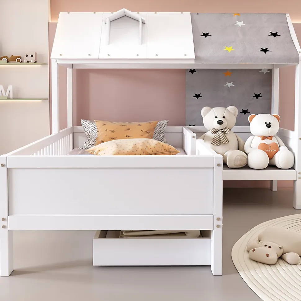 Design & styleCe lit 90×200 cm reprend la silhouette d’une petite maison pour offrir un espace de sommeil à la fois sécurisé et stimulant pour l’enfant. Sa finition blanche et ses lignes simples permettent une intégration discrète et contemporaine dans la chambre.Fonctionnalité & rangement Tiroirs pratiques intégrés sous le lit pour organiser jouets, linge ou accessoires. Compatibilité matelas : 90×200 cm, épaisseur maximale recommandée 13 cm (matelas non fourni). Capacité de charge conforme aux indications du fabricant (300 lbs environ 136 kg), conception pensée pour un usage quotidien.Matériaux & entretienStructure en bois massif associée à panneaux MDF offrant stabilité et durabilité. Finition blanche facile d’entretien : nettoyer avec un chiffon doux et éviter les produits abrasifs pour préserver l’aspect du bois.Installation & emballageProduit livré en 2 colis pouvant arriver séparément. Montage requis ; deux personnes sont recommandées pour un assemblage sûr. Les mesures sont fournies à titre indicatif (tolérance d’environ 2–3 cm). Vérifiez les éléments et suivez la notice fournie lors du montage.Informations complémentairesPoids net approximatif : 52,5 kg. Conception pensée pour optimiser la surface et le rangement dans les petites chambres d’enfant tout en proposant un espace de jeu et de repos agréable.