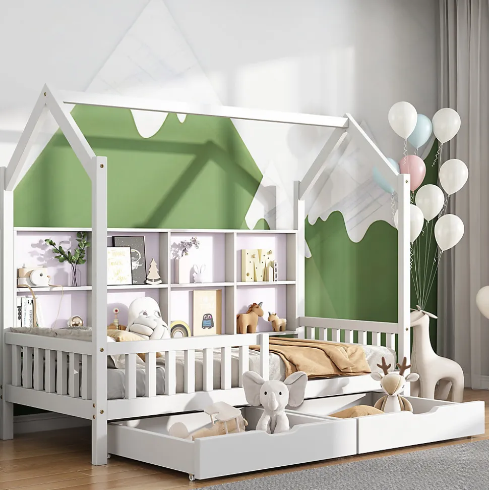 - Rangement optimisé grâce à la tête en forme de maison avec étagère pour livres et jouets, et 2 grands tiroirs montés sur roulettes offrant un espace pour linge de lit, vêtements et jouets.