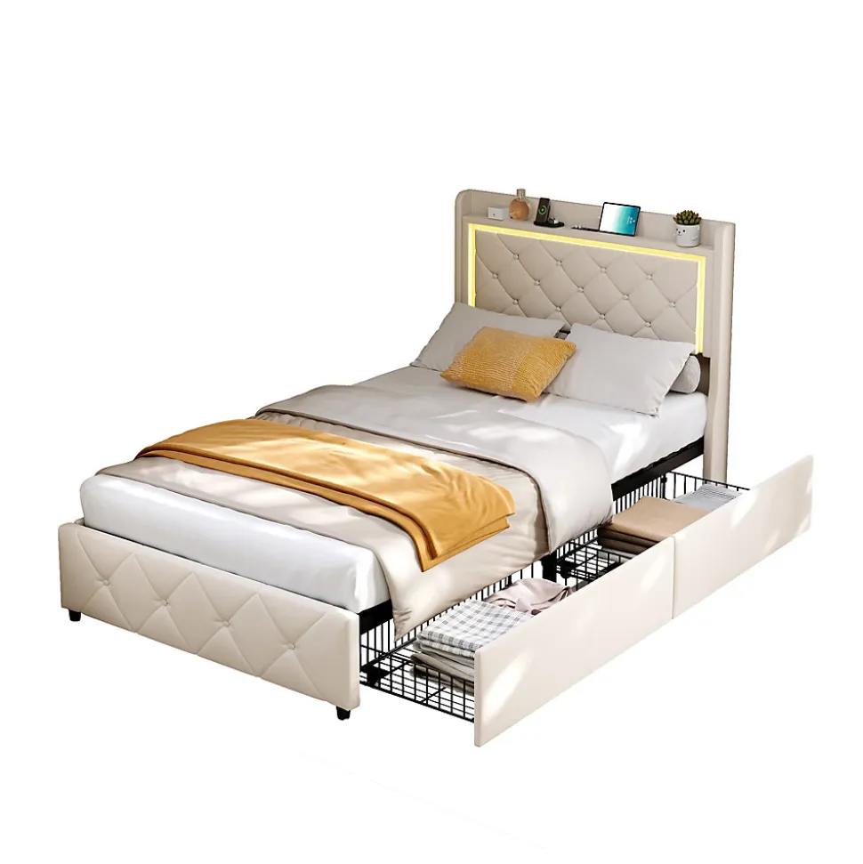Tissu velours doux et élégant : Revêtement en velours beige de haute qualité, agréable au toucher et confortable pour un sommeil de qualité. Rangement tête de lit et lit à gaz : Compartiments pratiques dans la tête de lit et lit à gaz pour ranger linge de lit, vêtements ou accessoires. Éclairage LED intégré : Lampes décoratives sur la tête de lit pour une ambiance chaleureuse et moderne dans la chambre. Port USB et Type-C pratique : Chargez facilement vos appareils électroniques sans encombrer la chambre avec des câbles supplémentaires. Construction robuste et durable : Structure solide et matériaux de qualité garantissant stabilité, confort et utilisation en toute sécurité au quotidien. Remarque : Taille applicable : 90 x 200 cm (hors matelas) Pour garantir la sécurité, les produits sont expédiés par lots et peuvent ne pas arriver le même jour. Veuillez patienter.