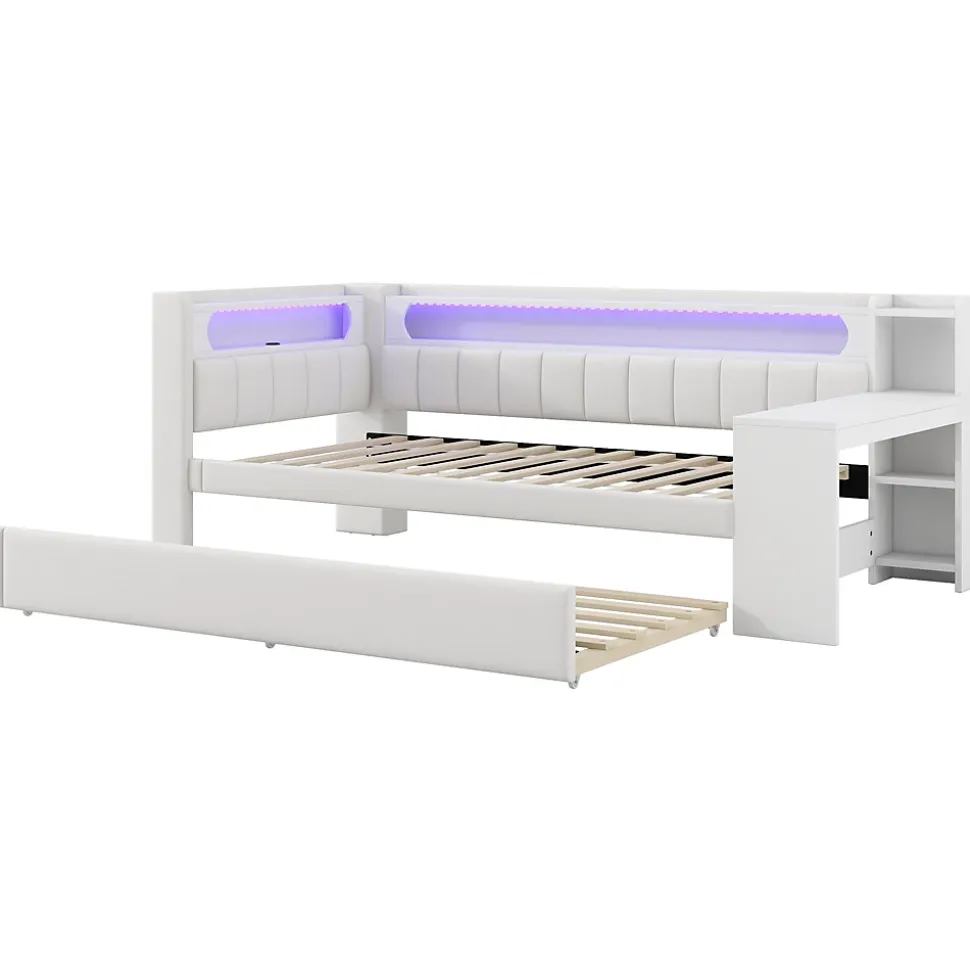 Design & styleCe lit 90×200 cm tapissé se distingue par sa silhouette nette et sa teinte blanche discrète. Le dossier en tissu imitation lin apporte une touche chaleureuse sans dominer la pièce, permettant une intégration aisée dans différents univers décoratifs.Fonctionnalité & rangementTiroir gigogne de couchage 90×190 cm pour accueillir un invité ou optimiser l’espace nuit.Bureau et étagères intégrés pour étudier ou travailler sans empiéter sur la surface de la chambre.Éclairage LED multicolore (7 couleurs) et ports USB intégrés pour plus de praticité au chevet.Matériaux & soliditéStructure en MDF et contreplaqué avec revêtement tapissé, renforts en plywood et 12 lattes Pilwood assurant maintien et stabilité. Dimensions totales : 237 x 103,5 x 93,5 cm ; dimension intérieure du couchage : 90×200 cm. Capacité recommandée : 150 kg. Épaisseur de matelas conseillée : 10–12 cm.Installation, entretien & emballageProduit livré en 3 colis et nécessitant un montage; deux personnes sont recommandées pour un assemblage sûr. Nettoyage simple : dépoussiérage régulier et essuyage avec un chiffon doux. Origine : Chine. Les colis peuvent arriver séparément selon la logistique.