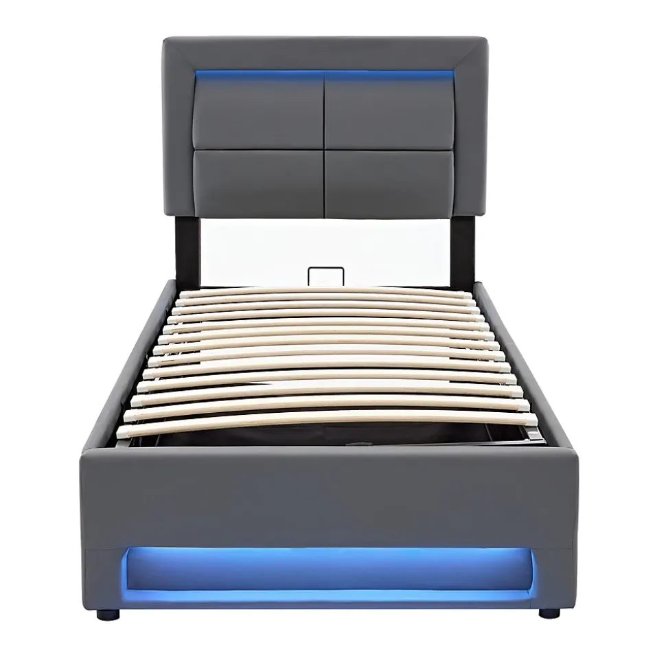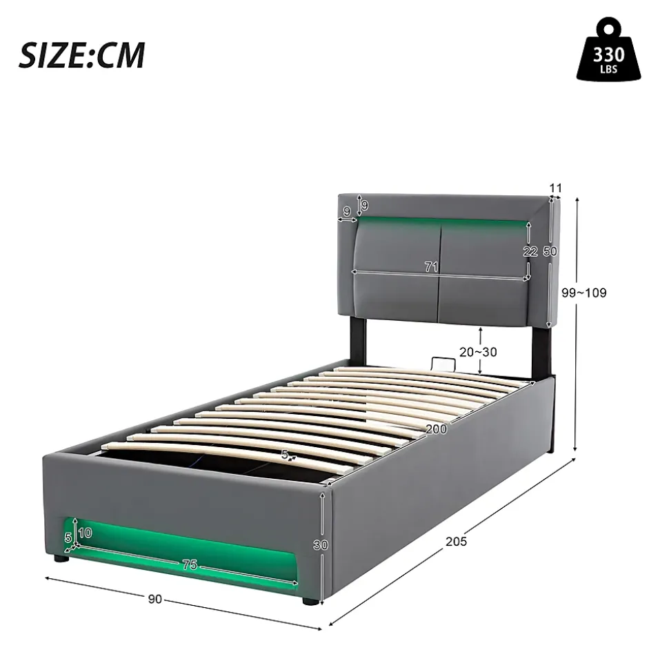 Design & styleCe lit 90×200 cm associe lignes épurées et revêtement en PU gris à effet litchi pour un aspect contemporain et facile à intégrer dans différentes ambiances. La tête et le cadre rembourrés apportent une finition soignée et un confort visuel adapté à la chambre.Fonctionnalité & rangement Éclairage LED multicolore commandé par télécommande offrant 12 nuances pour ajuster l’atmosphère selon l’usage (lecture, détente ou veilleuse). Ports USB intégrés à structure à poussoir : en position relevée deux prises USB sont accessibles pour la charge câblée ; en position rentrée la surface permet le positionnement d’appareils compatibles pour une charge sans fil. Coffre de rangement sous le sommier pour organiser literie, vêtements ou autres objets et optimiser l’espace de la chambre.Matériaux, support & entretienCadre tapissé en PU facile d’entretien, surface nettoyable avec un chiffon doux. Sommier à lattes larges (5 cm) assurant une bonne tenue du matelas et une répartition homogène des charges. Charge maximale recommandée : 150 kg. Convient à un matelas 90×200 cm, épaisseur conseillée 20 à 30 cm.Installation & emballageMontage requis, deux personnes recommandées pour un montage sécurisé. Produit livré en 2 colis pouvant arriver séparément. Poids net : 37,9 kg. Fabrication d’origine Chine. Livré sans matelas.