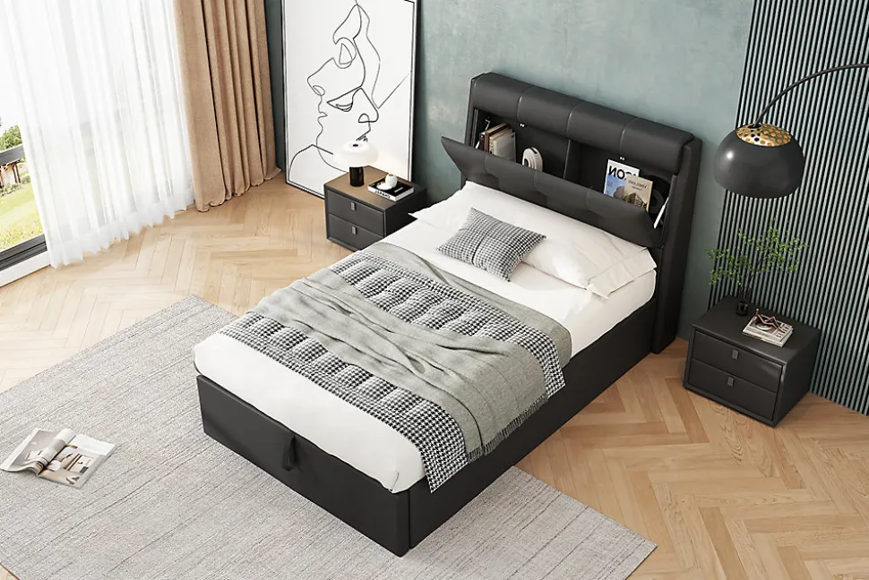 - Design contemporain et sobre, tapissé en PU noir pour un toucher agréable et un entretien facile ; tête de lit avec rangement discret pour une chambre ordonnée et harmonieuse.