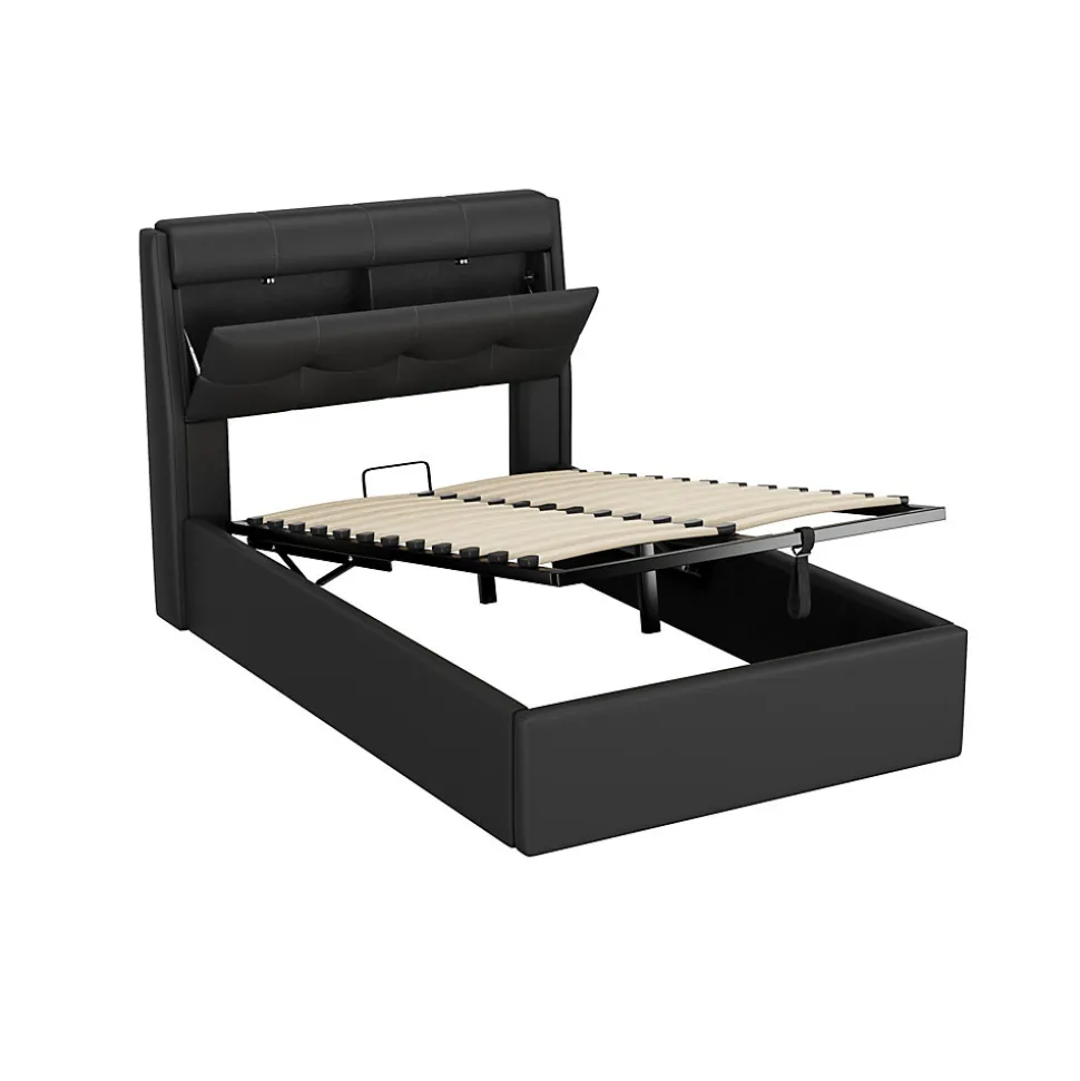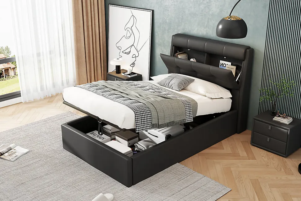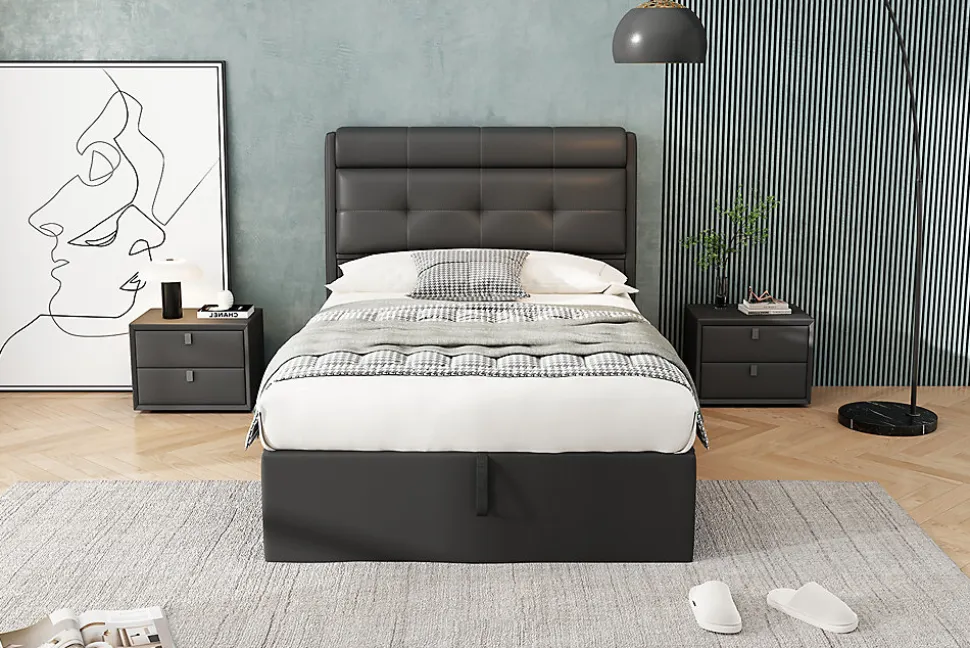 Design & styleCe lit 90×200 cm présente un design moderne et épuré, habillé d’un revêtement en PU noir pour une esthétique élégante et discrète. Sa finition invite à une atmosphère contemporaine tout en restant facile à intégrer dans différents styles de chambre.Fonctionnalité & rangement Tête de lit avec espace de rangement dissimulé, pratique pour les oreillers ou petits objets. Coffre sous sommier accessible grâce au système hydraulique, optimisant le rangement du linge et des accessoires saisonniers. Sommier à lattes inclus pour un soutien adapté et une bonne ventilation du matelas compatible 90×200 cm. Capacité d’utilisation adaptée au quotidien avec une charge maximum recommandée de 120 kg.Matériaux & entretienStructure tapissée en PU facile d’entretien, offrant un toucher agréable et un aspect uniforme. Le revêtement se nettoie simplement avec un chiffon doux et un produit d’entretien non abrasif. Matériaux conçus pour un usage courant, garantissant une surface résistante et pratique.Installation & emballageMontage requis, deux personnes recommandées pour un assemblage sûr. Produit livré en 2 colis, poids net approximatif 40,9 kg. Matelas non fourni. Informations complémentaires : origine Chine. Les pièces et le sommier sont fournis pour une installation complète conformément aux indications du guide de montage.
